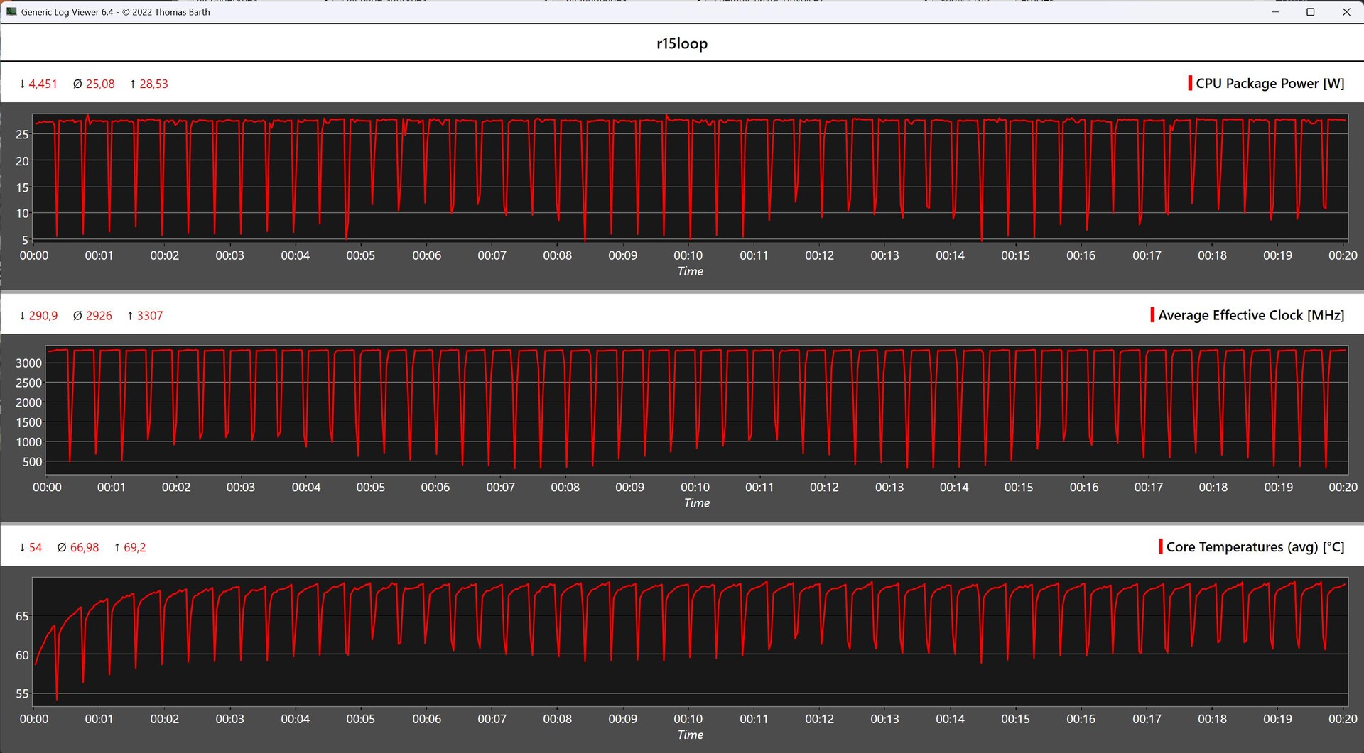 Die Cinebench-R15-Dauerschleife fordert dem AMD Ryzen 7 7840U einiges ab. Somit können wir an dieser Stelle schon einmal einen Blick auf die Leistungsfähigkeit der Kühleinheit werfen. Die Auswertung der 50 Durchläufe zeigt eine sehr stabile Leistungsentfaltung. Mit einem durchschnittlichen Ergebnis von 1.896 Punkten kann sich der Minisforum Mercury Series EM780 auch hier wieder einen guten zweiten Platz erkämpfen. Die Auswertung der CPU-Daten zeigt, dass das SoC die Leistungsaufnahme von 28 Watt dauerhaft halten kann. Bei den CPU-Temperaturen notieren wir knapp 70 °C in der Spitze, was darauf hindeutet, dass Minisforum hier eine sehr effektive Kühleinheit verbaut.