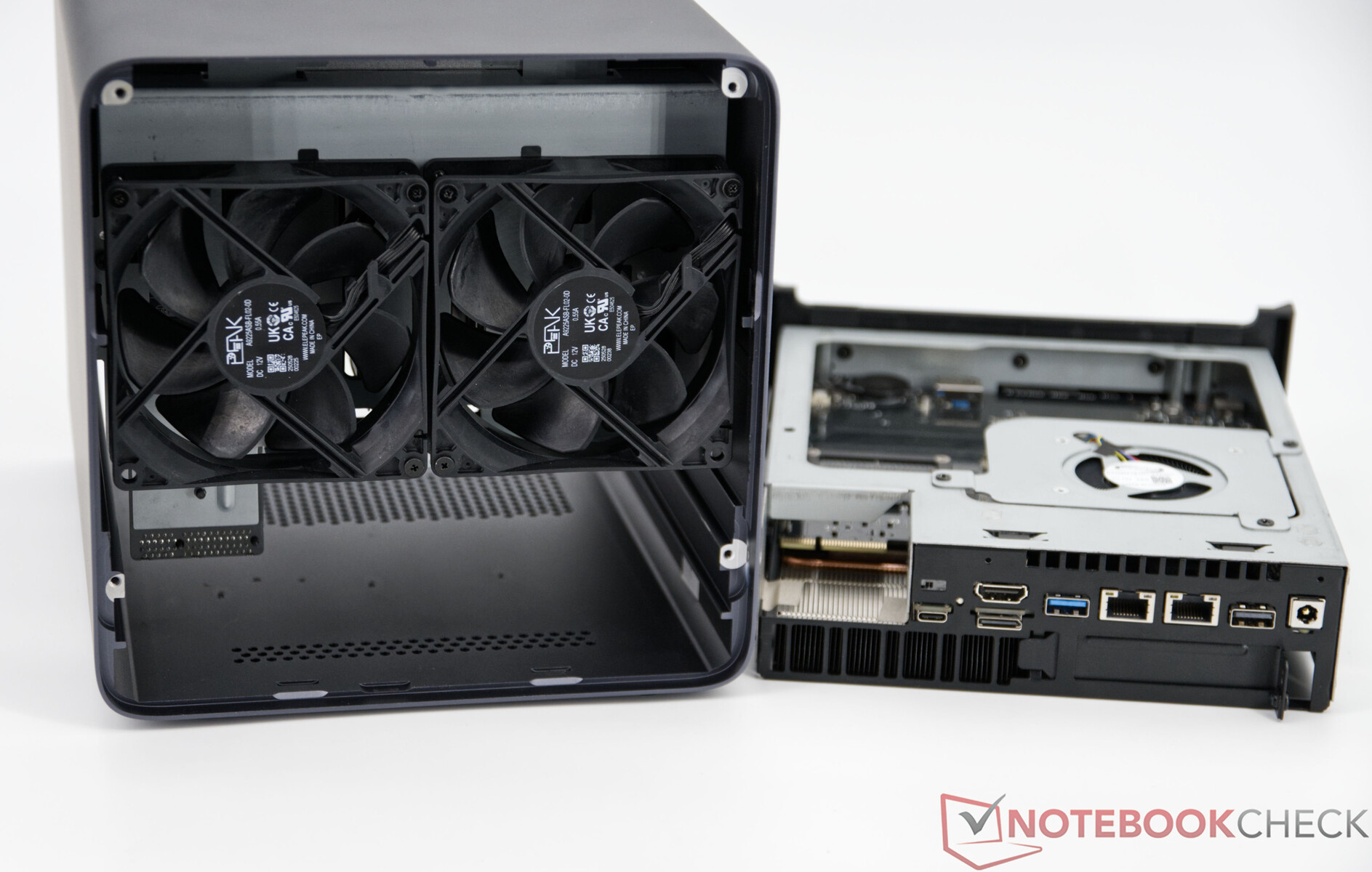 Als NAS-Lösung zeigt sich der Minisforum N5 Pro vielseitig und praxisorientiert. Zwei schnelle LAN-Anschlüsse (10 Gbit und 5 Gbit) ermöglichen schnelle Netzwerkverbindungen, während der modulare Aufbau einfache Wartungsarbeiten ermöglicht. Die fünf Festplatteneinschübe lassen sich werkzeuglos tauschen, und auch die interne Mini-PC-Basis ist mit wenigen Handgriffen zugänglich. Trotz der kompakten Bauweise bleibt das Kühlsystem effektiv: Selbst unter Dauerlast bleibt die Temperatur niedrig, ohne dass die Lüfter unangenehm laut werden.