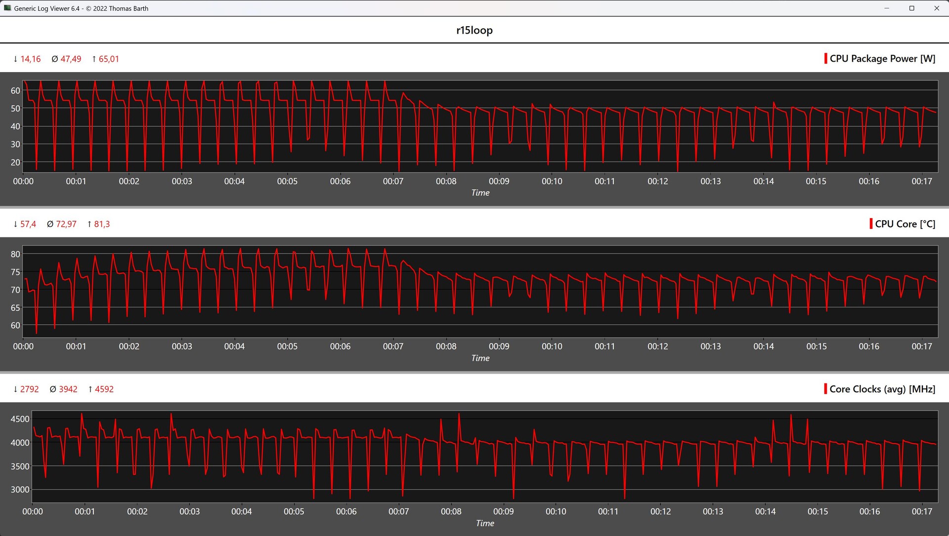Während der Cinebench-R15-Dauerschleife schauen wir uns das Verhalten des SoC über einen längeren Zeitraum unter Belastung an. Alle 50 Durchläufe absolviert der Minisforum Neptune Series HX77G ohne gravierenden Leistungsverlust. Dennoch sehen wir, dass etwa zur Hälfte des Tests die CPU-Leistung etwas nachlässt, sich dann aber wieder stabilisiert. Gegenüber den Kontrahenten reicht es für unser Testsample, sich den zweiten Platz zu sichern.