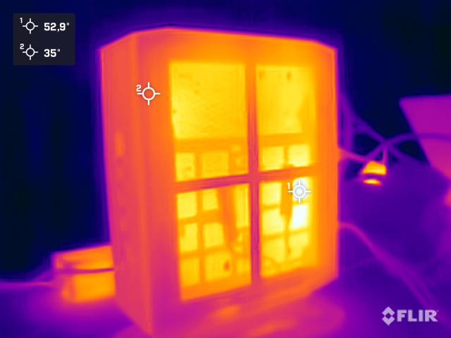 Das Gehäuse des Minisforum Neptune Series NAD9 besitzt viele Öffnungen, in denen Frischluft angesaugt und warme Luft aus dem Gehäuse entweichen kann. Außerdem ist auf dem Intel Core i9-12900H ein vergleichsweise großer Kühler mit drei Heatpipes installiert, welcher das SoC im Rahmen der definierten Power-Limits gut gekühlt bekommt. Bei der Cinebench-R15-Multi-Schleife haben wir schon gesehen, dass der maximale Turbo des SoCs nicht sehr lange aufrecht erhalten wird, weshalb im weiteren Verlauf nur noch 45 Watt abgeführt werden müssen. Zudem ist im BIOS ab Werk die maximale Temperatur des SoC bei 87 °C begrenzt, was im Umkehrschluss bedeutet, dass das Thermal-Throttling schon ab diesem Schwellwert greift. Erreicht wird dieser Wert bei unserer Tests allerdings immer. Beim Lasttest mit FurMark notieren wir kurzfristig 90 °C.
