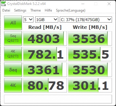 In unserer Testausstattung des Minisforum Neptune Series NAD9 steckt eine 512-GB-SSD von Kingston. Bei dem verbauten Modell handelt es sich um einen Massenspeicher im M.2-2280-Format. Im Test kann die SSD mit sehr schnellen Übertragungsraten aufwarten. Extrem gut ist zudem der 4K-Lesewert mit über 100 MB/s. Leichte Probleme sehen wir bei der verbauten SSD nur bei dauerhafter Leseleistung. Der NAD9 kann mit insgesamt drei Massenspeichern bestückt werden. Auf der Rückseite des Mainboards gibt es eine Vorrichtung, um zwei 2,5-Zoll-Datenträger zu montieren. Die nötigen Anschlusskabel sind bereits im Gerät vorhanden.