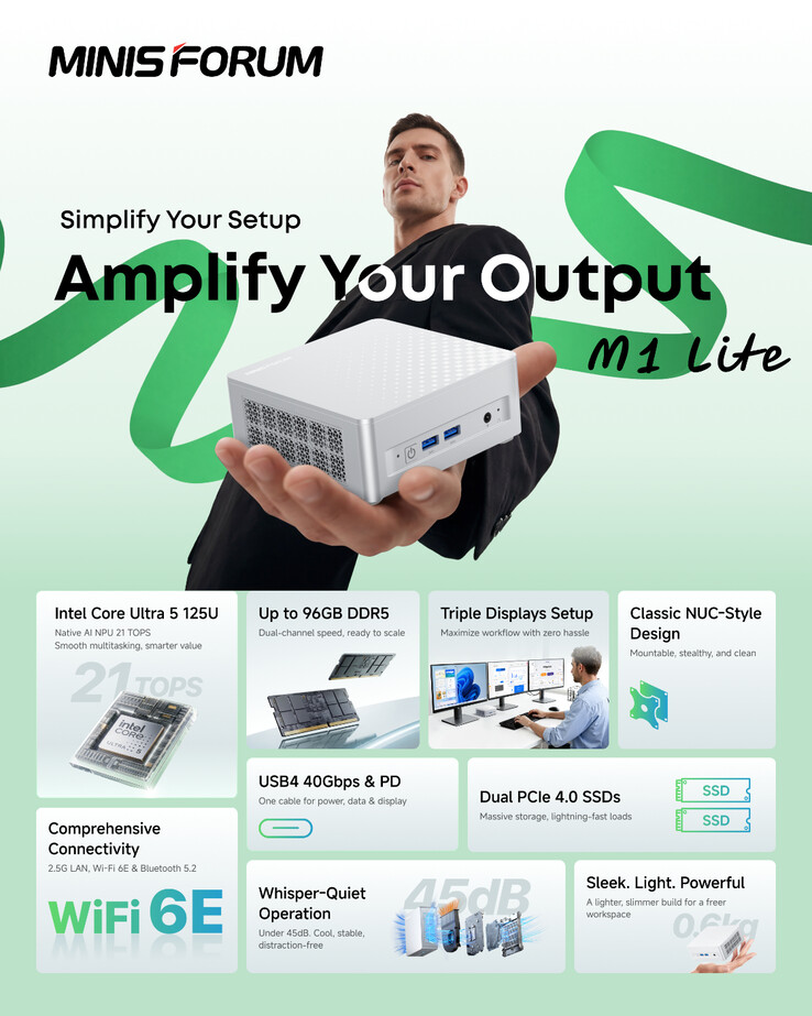 Minisforum hat seine M1-Mini-PC-Serie um ein neues Modell auf Intel-Basis erweitert. Zur Einordnung: Das Unternehmen brachte im Dezember 2025 den Minisforum M1 Plus auf den Markt. Während der Minisforum M1 Plus mit Prozessoren der Alder-Lake-H-Serie ausgestattet ist, setzt der neuere Minisforum M1 Lite stattdessen auf Intels Meteor-Lake-U-Plattform in Form des Core Ultra 5 125U.