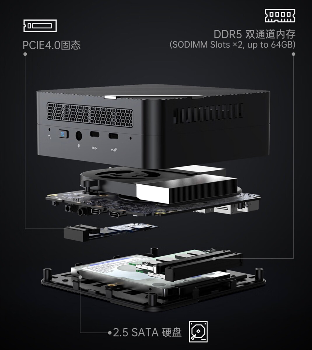 Der Minisforum UM773 wird als Barebones angeboten, wobei der PC Platz für zwei DDR5-SODIMMs, für eine PCIe 4.0 M.2 SSD und für eine 2,5 Zoll SATA-Festplatte bietet. Wie bei Minisforum üblich gibts eine vergleichsweise große Anschluss-Auswahl, inklusive zweimal HDMI, zweimal USB-C, viermal USB-A, 2,5 Gbit/s Ethernet und einem Kopfhöreranschluss.