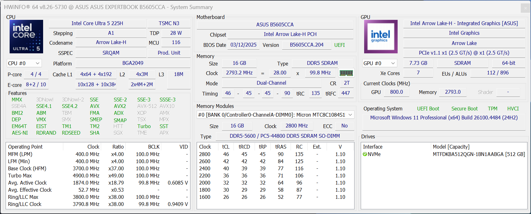 | Asus ExpertBook B5 B5605CCA Intel Core Ultra 5 225H ⎘ Intel Arc Graphics 130T ⎘ 16 GB RAM, 512 GB SSD | Amazon: 1.222,00 € Bestpreis 1212.95€ Schwanthaler-Computer 2. 1212.95€ office-partner.de 3. 1212.97€ playox.de | 1.7 kg | 18 mm | 16.00" 2560x1600 189 PPI IPS | |