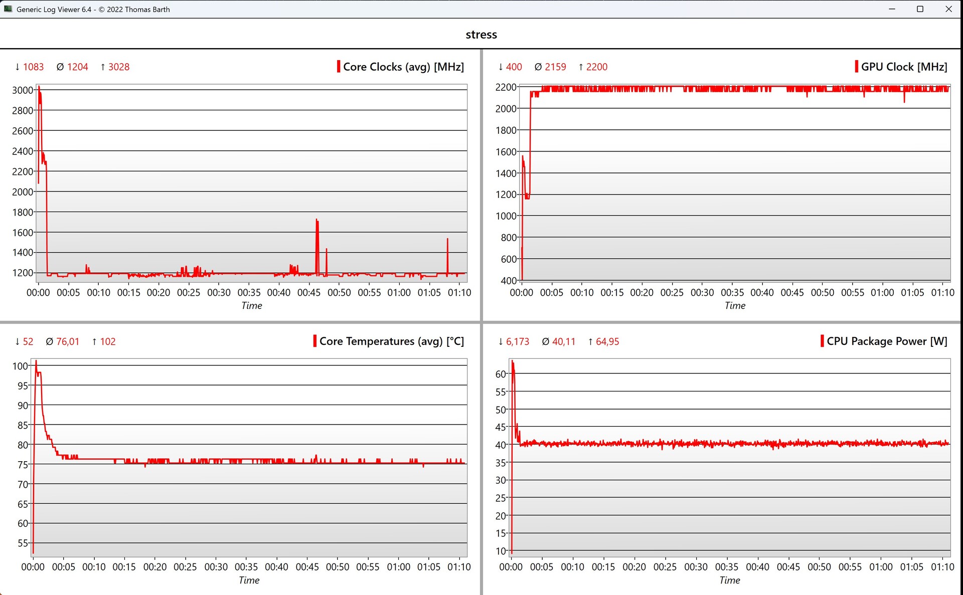 Das ExpertBook B5 gehört mit einem maximalen Idle-Verbrauch von 10,1 Watt nicht zu den sparsamsten Modellen. Bei voller Belastung messen wir kurz knapp 70 Watt, hier ist also das Netzteil der begrenzende Faktor. Dieser Wert pendelt sich dann aber schnell bei ~63 Watt ein, das mitgelieferte 65-Watt-Netzteil hat also kaum Reserven.