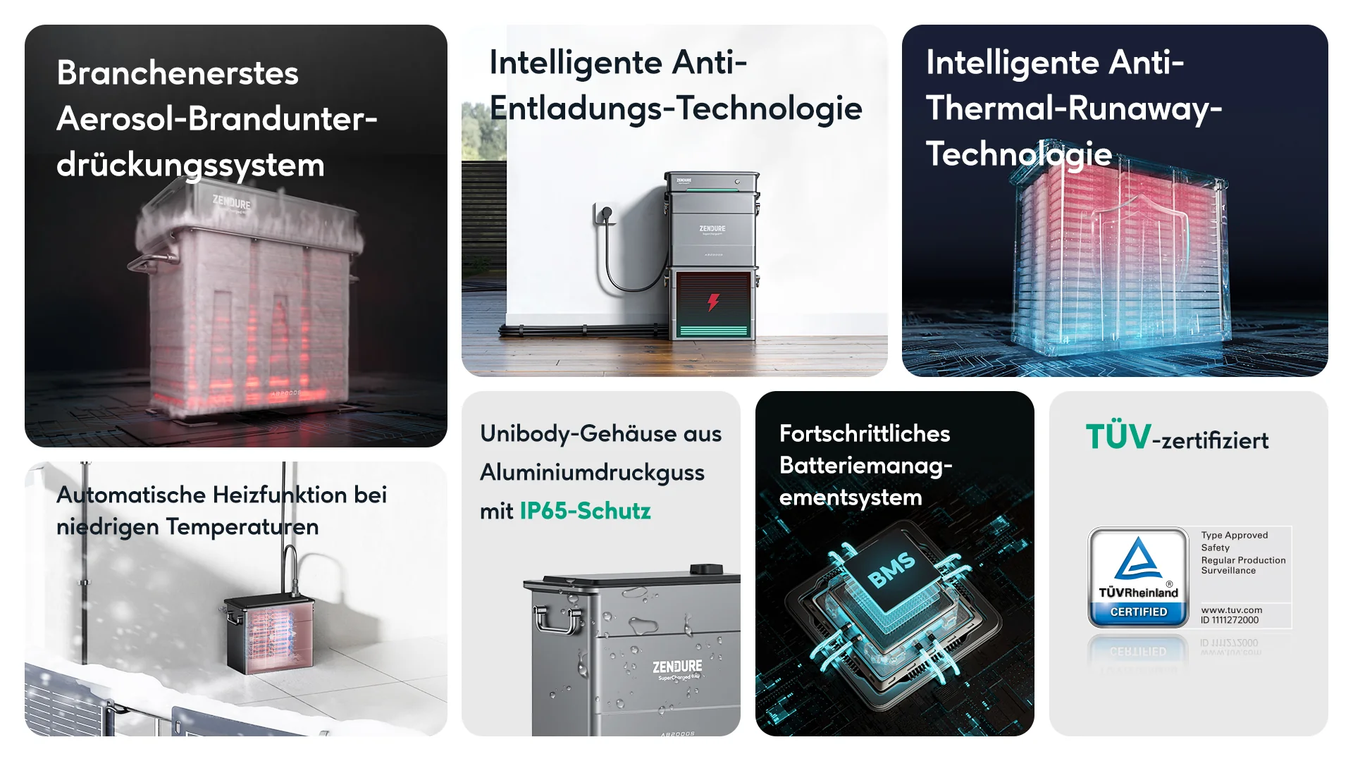 Zudem bieten die neuen SolarFlow-Batterien von Zendure weitere Sicherheitsfunktionen. Das Anti-Thermal-Runaway-Technologie verhindert Überhitzungen und der PACK-Level-Balancing-Algorithmus priorisiert das Laden von Batteriezellen mit geringer Kapazität, um so Überentladung und Überladung zu verhindern. Dazu ist gewohnt ein fortschrittliches Batteriemanagementsystem (BMS) zur kontinuierlichen Überwachung und Optimierung an Bord und es gibt wie bei der AB2000 eine Selbstheizung für Ladefähigkeit bei Temperaturen bis -20°C.