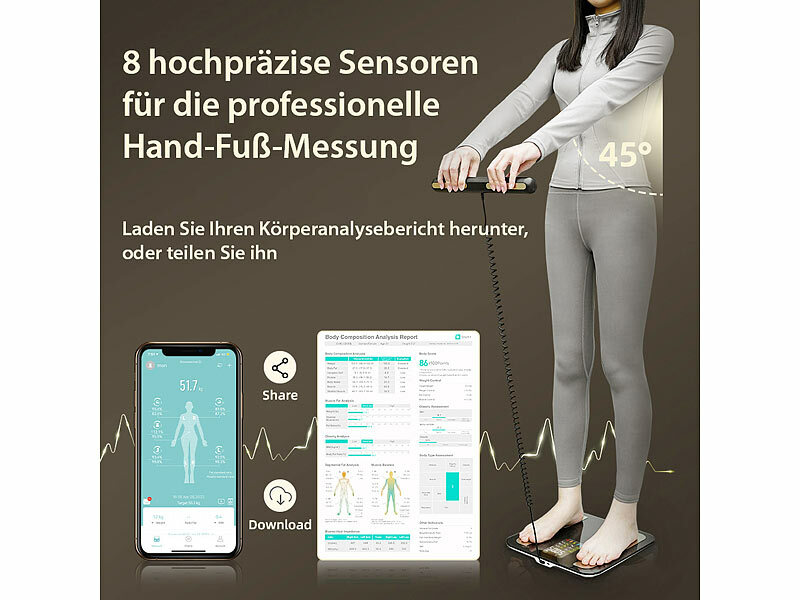 Messbar beziehungsweise errechenbar sollen auch der Wasseranteil, der Körpertyp, der BMI, die Muskelmasse und die Knochenmasse sein. Die App kann über Bluetooth mit einem Smartphone oder Tablet kommunizieren, dabei stehen Apps für Android- und iOS-Geräte bereit. Messwerte lassen sich auch über einen längeren Zeitraum auswerten, wodurch sich etwa die Auswirkungen geänderter Trainings- oder Ernährungsgewohnheiten verfolgen lassen sollen. Die Kompatibilität zu Apple Health, Google Fit, Samsung Health und Fitbit ist gegeben.