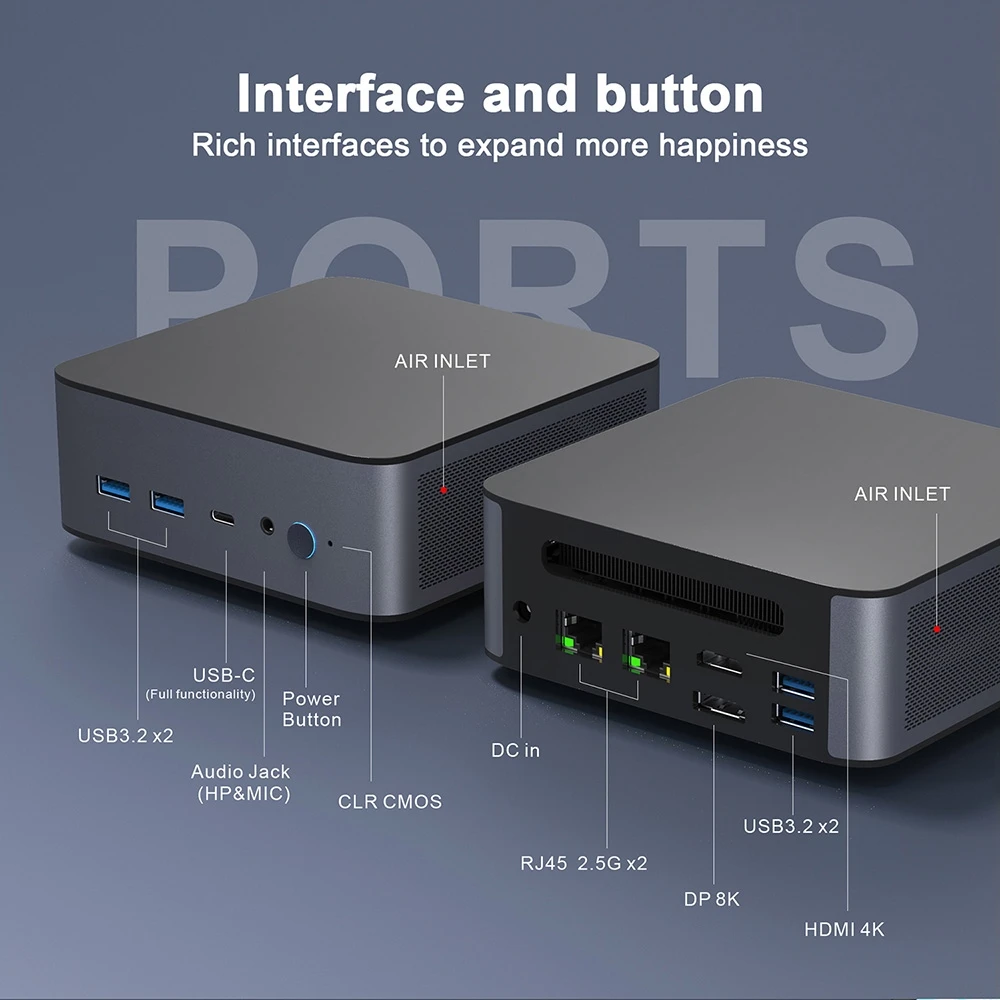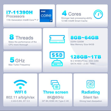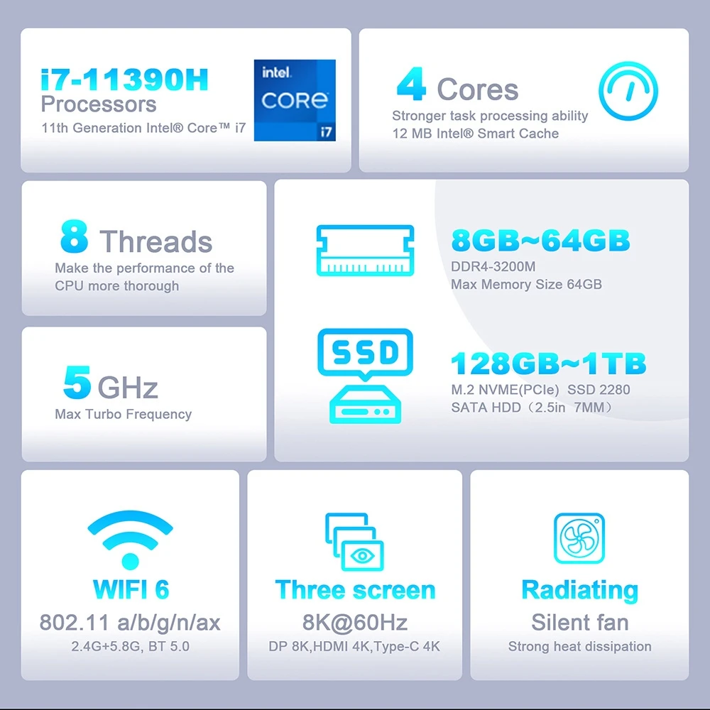 Der GXMO H90 ist ein mit dem Intel Core i7-11390H bestückter Mini-PC. Der Prozessor setzt sich aus vier Kernen und acht Threads sowie 12 MB Cache zusammen und arbeitet mit einem Spitzentakt von 5,0 GHz. Dazu integriert der Hersteller 16 GB DDR4 RAM sowie eine 512 GB große SSD in dem nur 13 x 12,7 x 5,2 cm und unter 500 g wiegenden Gerät. Der Arbeitsspeicher ist auf bis zu 64 GB erweiterbar. Auch die Möglichkeit für ein Upgrade des Speicherplatzes ist gegeben.
