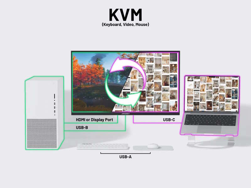Ein KVM-Switch ist verbaut. Damit lässt sich beim Wechseln des Zuspielers auch gleich die Zuordnung der über USB Typ A angeschlossenen Zubehörteile und damit im Regelfall von Tastatur und Maus wechseln. Inhalte von zwei Zuspielern lassen sich nebeneinander oder ineinander anzeigen. Der Monitor kann an eine VESA-Halterung montiert werden. Bereits mit dem mitgelieferten Standfuß sind die Verstellung in der Höhe, Drehung und Neigung möglich.