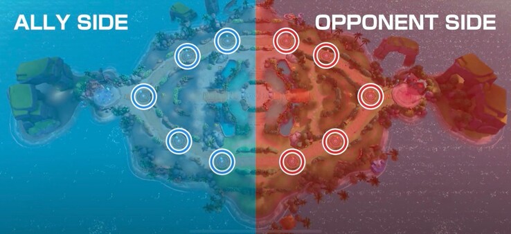 Auf dem Schlachtfeld gibt es auf der Seite jedes Teams fünf "Scoring Areas", die das gegnerische Team einnehmen muss. Die bei MOBAs üblichen Computer-Gegner sind in Form von wilden Pokémon vertreten, die man fangen muss, um seinen Level zu erhöhen, stärker zu werden und Punkte zu erhalten. Pokémon können dabei auch neue Attacken lernen und sich weiter entwickeln. Statt die Basis seiner Gegner zu zerstören ist das Ziel des Spiels einfach, innerhalb des Zeitlimits mehr Punkte als das gegnerische Team zu erlangen.
