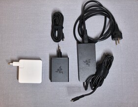 Wie viel Platz im Rucksack gespart wird, das zeigen unsere unten eingebetteten Vergleichsfotos, in denen das 130 Watt GaN-Ladegerät von Razer neben Apples neuestem 96 Watt Ladegerät und dem mitgelieferten 100 Watt Netzteil des Razer Blade Stealth 13 zu sehen ist.