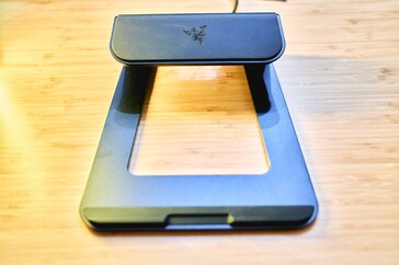 Zweitens wird die Tastatur angewinkelt, wodurch das Tippen angenehmer wird. Die gummierte Oberfläche des Standfußes verhindert, dass der eigene Laptop zerkratzt wird oder auf dem Stand verrutscht. Drittens besitzt der Standfuß über eine integrierte RGB-Beleuchtung, die per Razer Chroma mit weiteren Produkten synchronisiert werden kann. Dieses weiche Licht ist besonders angenehm, wenn bei wenig Licht gearbeitet wird.