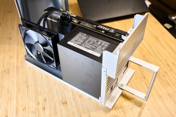 Der Razer Core X besitzt ein Netzteil mit einer Leistung von 650 Watt, was ausreicht, um Grafikkarten mit einer Leistungsaufnahme von bis zu 500 Watt zu versorgen, und das per USB-C angeschlossene Notebook mit maximal 100 Watt aufzuladen. Grafikkarten können bis zu drei Slots bzw. 6 Zentimeter breit, 33 Zentimeter lang und 16 Zentimeter hoch sein, um in das Gehäuse zu passen. Das reicht für die meisten aktuellen High-End-Grafikkarten.