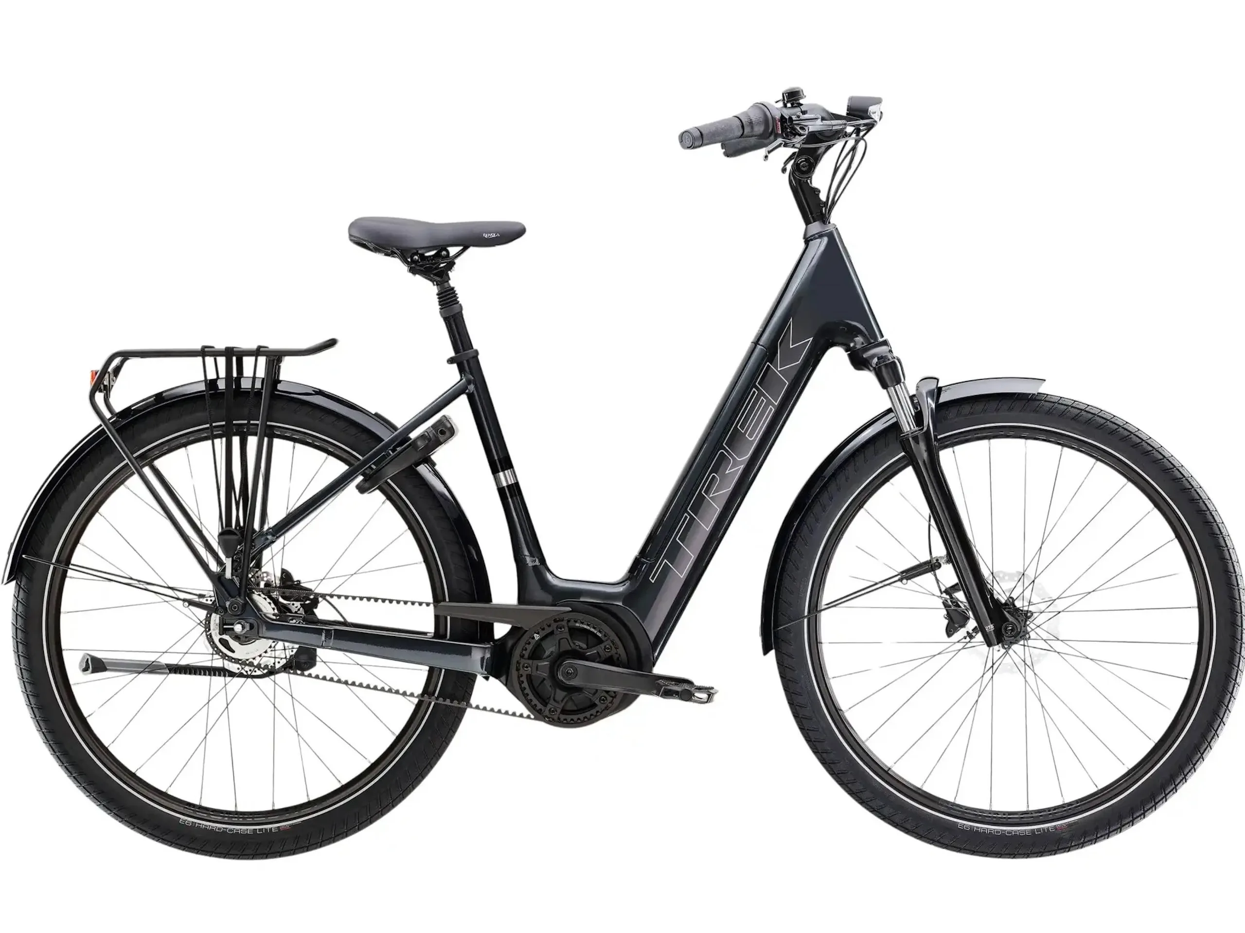 Nicht selbstverständlich: Trek verzichtet auf die Nutzung einer Fahrradkette, die Kraftübertragung erfolgt stattdessen über einen Carbonriemen. Ein solcher soll sich durch einen besonders geringen Wartungsaufwand auszeichnen, eine Nabenschaltung von Shimano mit acht Gängen steht bereit, womit sich im Prinzip auch ohne (starke) Motorunterstützung etwa an Anstiegen angenehm fahren lassen dürfte. Verbaut ist ein Mittelmotor von Bosch und des Typs Active Line Plus, wobei dieser mit einem Drehmoment von 50 Nm diesbezüglich keine neuen Rekorde aufstellen dürfte. Trek nutzt ein Bosch Purion 200-Display, dabei handelt es sich um ein eher kompaktes Display.