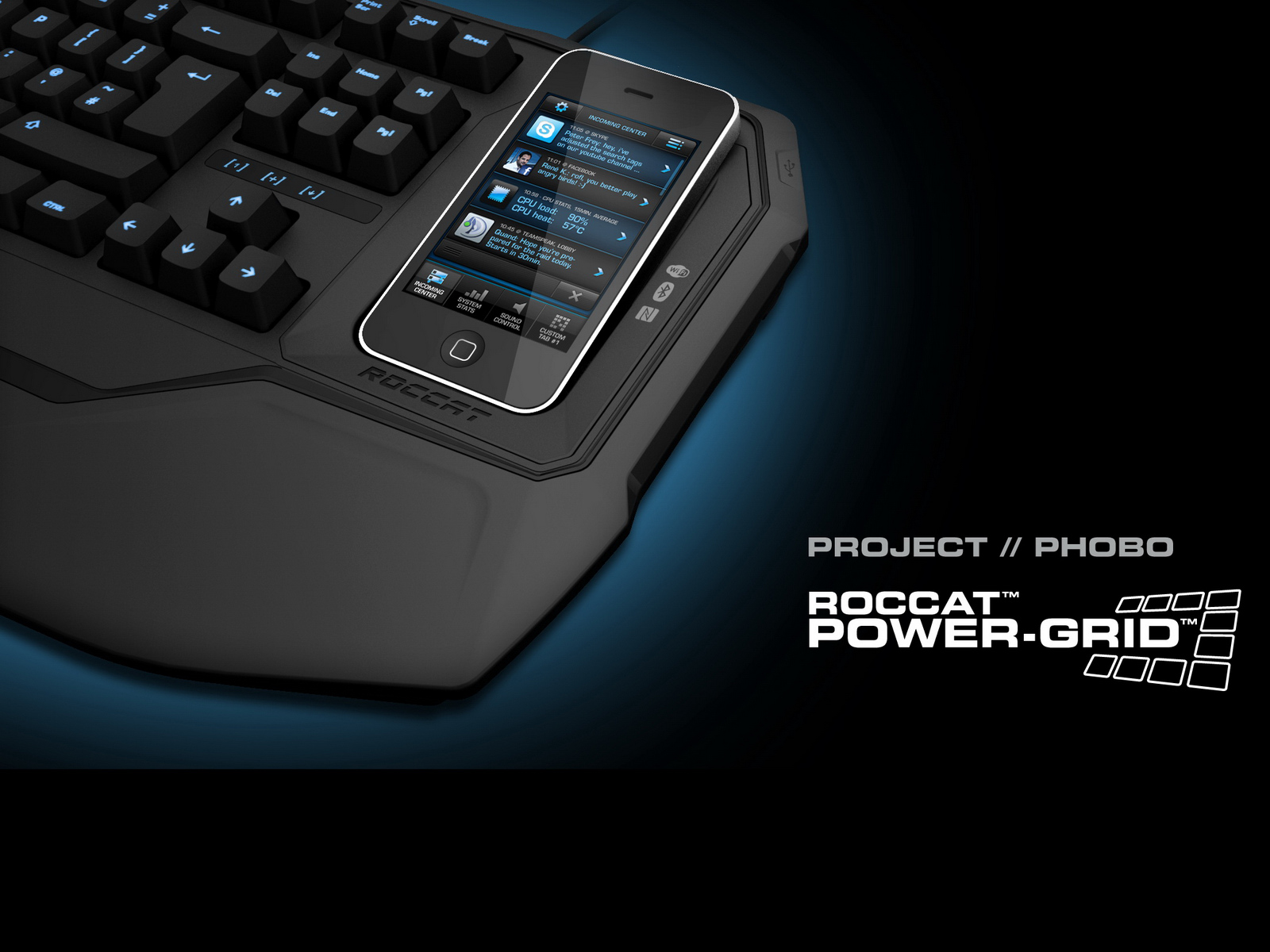 Als erstes Projekt aus der Roccat Smart Gear Serie präsentiert Roccat das "Phobo" als "Phone Board". Das Phobo ist ein Gaming-Keyboard und das künftige Zuhause für ein Smartphone mit der Power-Grid App. In die Halterung eingelegt kann der Spieler jede Art von Textnachricht mithilfe des Phobo Keyboards eingeben - Facebook, Skype, Teamspeak - auch eingehende Telefonanrufe annehmen und die Gespräche mit dem direkt am Phobo angeschlossenen Headset führen. Zudem kann das Phobo als Ladestation für das Smartphone dienen - genial!