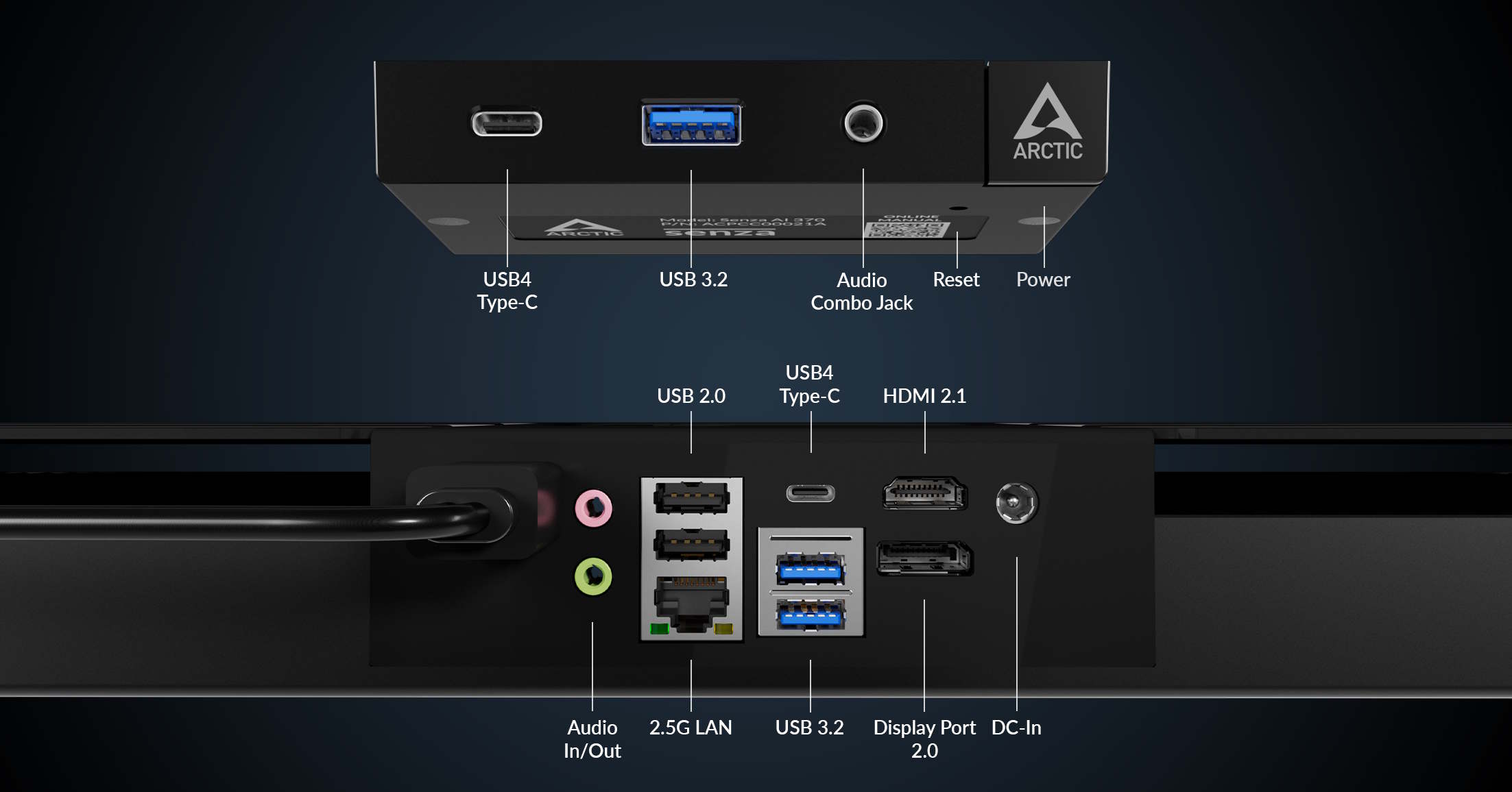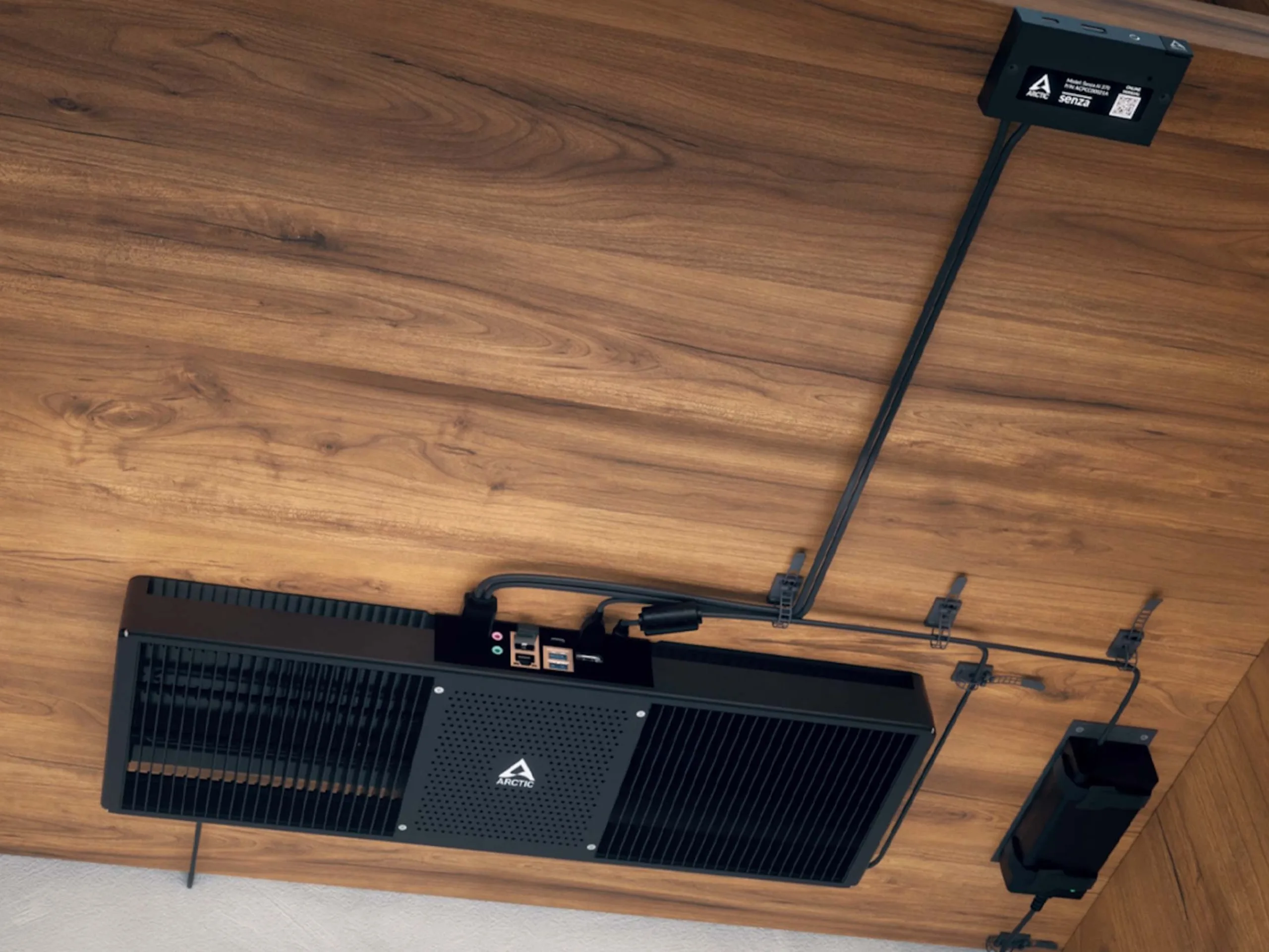 Wir haben schon einmal über den Hersteller Arctic und speziell über ein kompaktes PC-System des Unternehmens berichtet. Nun gibt es mit dem Senza AI 370 ein neues PC-System, welches unter der Tischplatte montiert wird. Damit nimmt dieses keinen Platz auf oder unter dem Tisch ein und kann damit für einen sehr aufgeräumten Schreibtisch sorgen. Sehr sinnvoll: Es gibt ein Frontpanel, welches an der Vorderseite der Tischplatte montiert wird. In diesem ist der Anschalter zu finden, allerdings auch noch einmal USB4 und USB 3.2 im Typ A. Dazu kommt noch ein kombinierter Klinkenanschluss für die Anbindung eines Headsets.