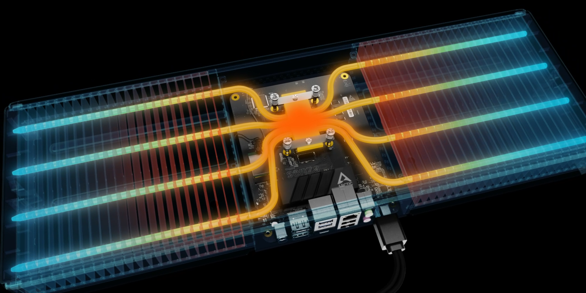 Das 536 × 180 × 50 Millimeter große System bringt dann auch die Bildanschlüsse mit. So stehen einmal HDMI 2.1 und DisplayPort 2.1 bereit. Dazu kommt auch USB4. Vorhanden sind noch jeweils zweimal USB 3.2 Gen2 und USB 2.0 im Typ A. Die Netzwerkanbindung kann kabelgebunden über Ethernet mit bis zu 2,5 GBit/s erfolgen. WiFi 7 und Bluetooth 5.3 sind nutzbar. Verbaut ist ein 32 Gigabyte großer LPDDR5X-8000-Arbeitsspeicher, eine M.2-SSD mit einer Kapazität von einem Terabyte ist vorhanden. Der Senza AI 370 soll nicht nur optisch, sondern auch akustisch unauffällig sein: So erfolgt die Kühlung auch des verbauten AMD Ryzen AI 9 HX 370 passiv. Das Kühlsystem nimmt dabei einen großen Teil des Gehäuses ein, gekühlt wird mit insgesamt acht Heatpipes. Angeboten wird das System für einen Preis von aktuell 1.030 Euro.
