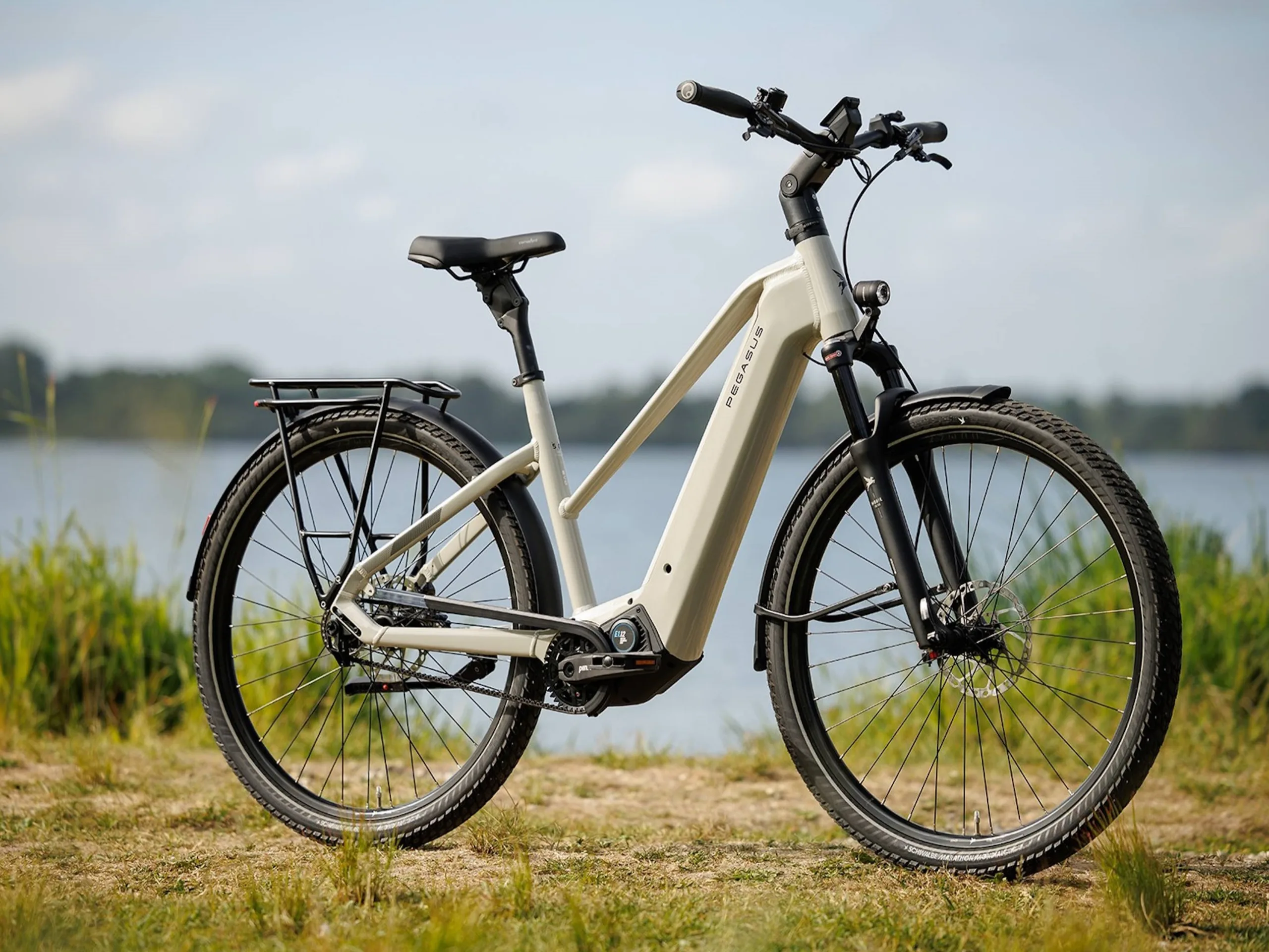 Das rund 26,4 Kilogramm schwere E-Bike kommt mit einer mehr oder weniger vollständigen Ausstattung. So sind eine Beleuchtung und ein Gepäckträger schon vorhanden, dazu kommt ein Fahrradständer. Der Gepäckträger ist zum MonkeyLoad-System kompatibel. Ebenfalls verbaut ist eine Federgabel, wie für ein Trekking-E-Bike typisch fehlt zwar ein Dämpfer, allerdings ist eine Federsattelstütze vorhanden, womit sich dann auch etwa auf Kopfsteinpflaster ein hoher Fahrkomfort ergeben dürfte. Pegasus verbaut vorne und hinten hydraulische Scheibenbremsen vom Typ Shimano Deore XT BR-M8120. Aufgezogen sind Schwalbe Marathon Mondial RaceGuard-Reifen, es kommen 2,25 Zoll breite und 28 Zoll große Reifen zum Einsatz. Genutzt wird ein FIT Compact-Display. Integriert ist ein Akku mit einer sehr ordentlichen Kapazität von 800 Wh.