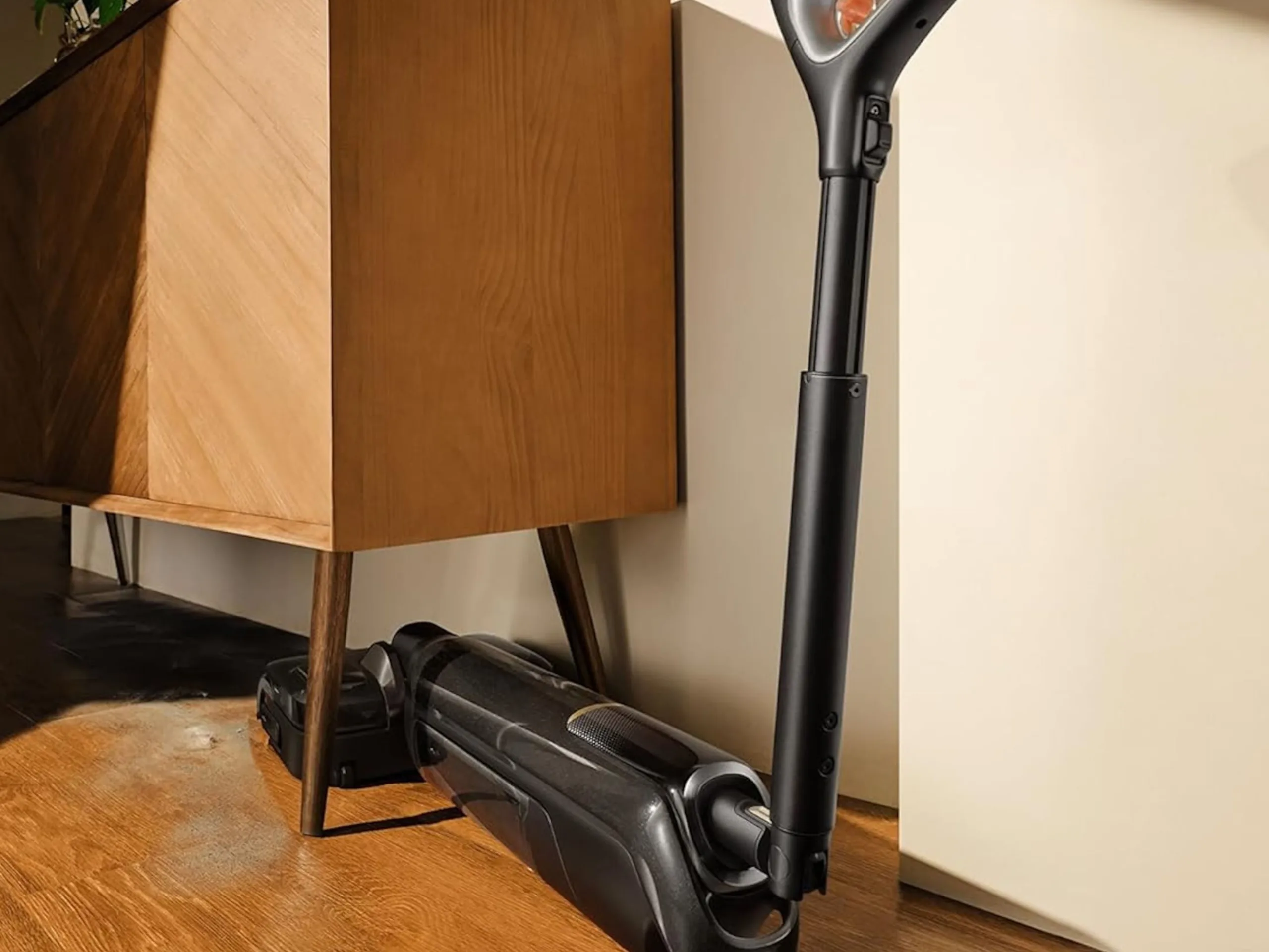 Durch ein intelligentes Antriebssystem soll sich der Wischsauger einfach manövrieren lassen. Der Griff lässt sich sozusagen abklappen, womit sich auch unter Möbeln wischen lässt, solange die Unterkante höher als rund 14 Zentimeter liegt. Die Griffeinheit lässt sich auch drehen. Ein Display ist integriert, unterstützt wird die Sprachsteuerung.