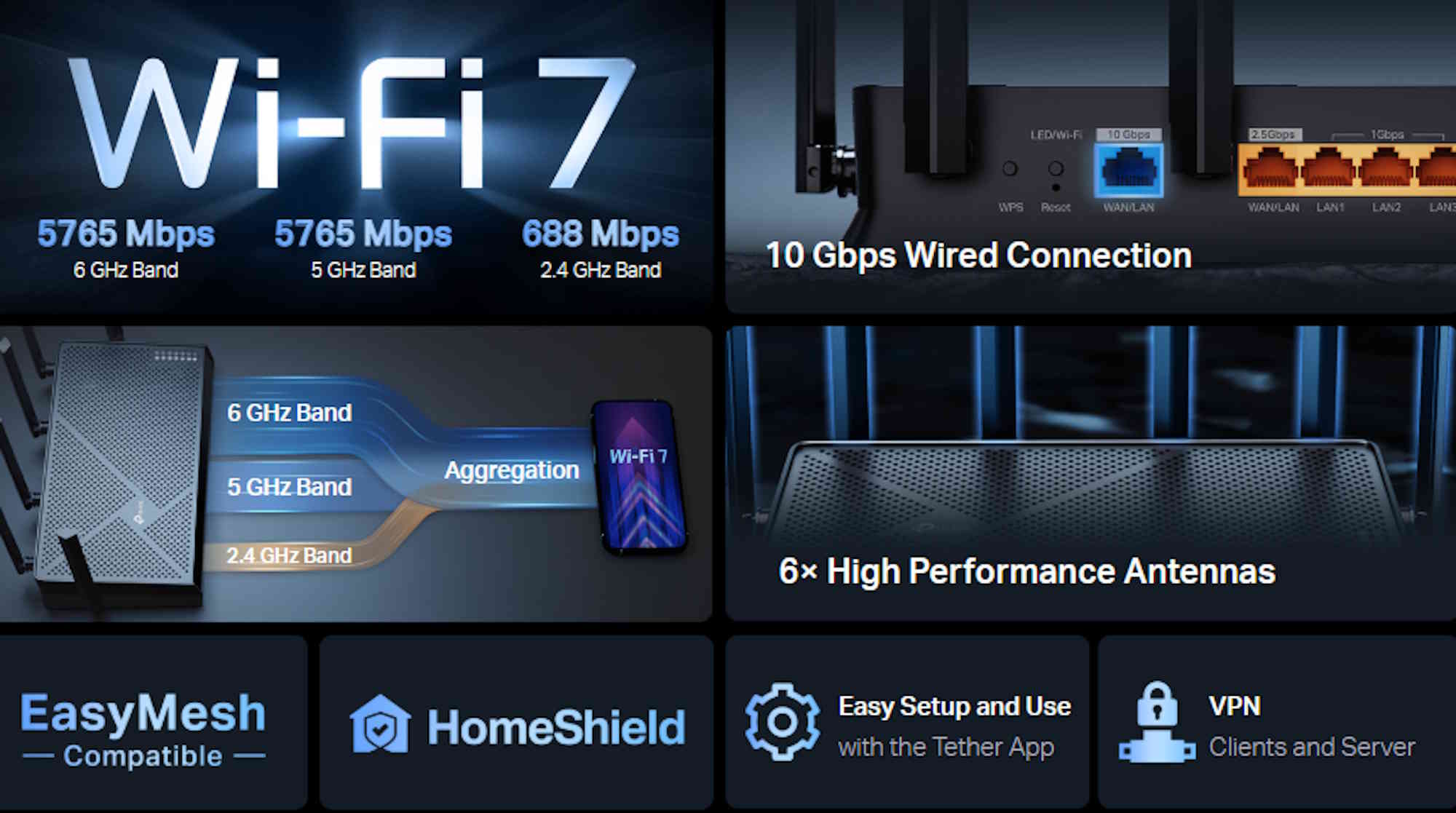 Der TP-Link Archer BE670 ist ein neuer WiFi 7-Router, welcher mit einer besonders hohen Leistung überzeugen soll. Das Modell unterstützt dabei nicht nur den WiFi 7-Standard, sondern auch die Datenübertragung im 6-GHz-Band und dort mit einer Datenübertragungsrate von bis zu 5.765 MBit/s, die identische Datenübertragungsrate wird für das 5-GHz-Band angegeben. Bei der Nutzung von 2,4-GHz-Verbindung ergibt sich eine maximale Datenübertragungsrate von 688 MBit/s. Geräte sollen für die beste Performance dann entsprechend in unterschiedlichen Bändern angesprochen werden, MU-MIMO und OFDMA werden unterstützt. Herstellerangaben zufolge ist der TP-Link Archer BE670 für Häuser mit drei Schlafzimmern geeignet, zur Abdeckung noch größerer Flächen oder auch der Verbesserung der Datenübertragungsqualität ist die Realisierung eines Mesh-Netzwerks via EasyMesh möglich. Es stehen sechs externe Antennen bereit, diese sind entsprechend auch deutlich sichtbar.