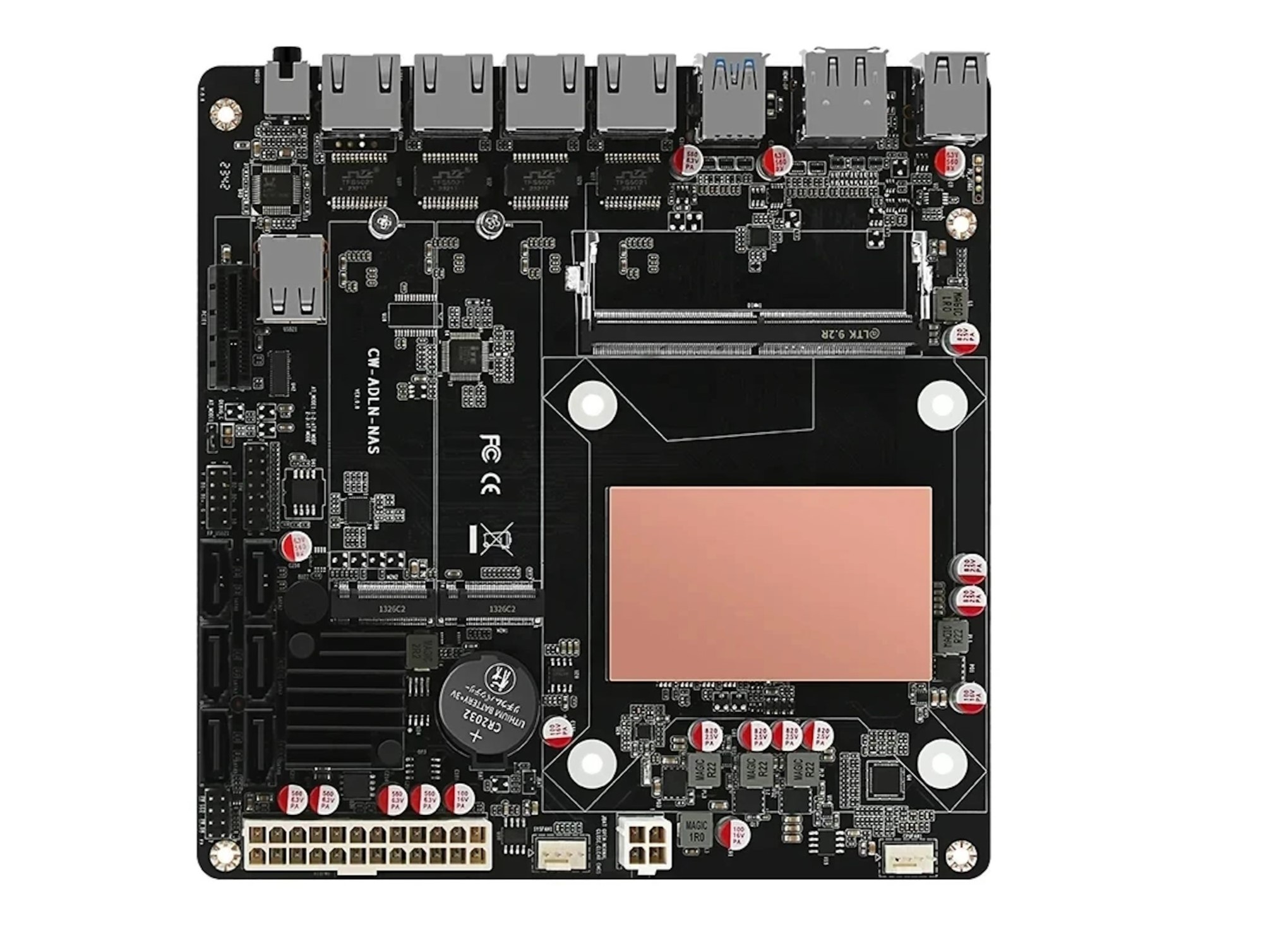 Als SoC kommt entweder ein Intel N95 oder ein Intel Core i3-N305 zum Einsatz, wobei ein kupferner Kühlkörper bereits installiert ist, ein CPU- und ein Gehäuse-Lüfter lassen sich auch bestellen und nutzen. Es kann ein bis zu 32 Gigabyte großer DDR5-Arbeitsspeicher mit einer Taktfrequenz von bis zu 5.600 MHz installiert werden, ECC-Speicher wird nicht unterstützt. Für die Anbindung von Massenspeichern stehen ganze sechs SATA III-Anschlüsse bereit. Die Installation von bis zu zwei M. 2280-SSDs ist möglich, wobei die Installation einer zweiten M.2-SSD die Nutzung des PCIe-Slots ausschließt. Die Netzwerkanbindung gelingt über gleich vier RJ45-Ports - welche jeweils eine Datenübertragungsrate von 2,5 GBit/s bieten sollen.