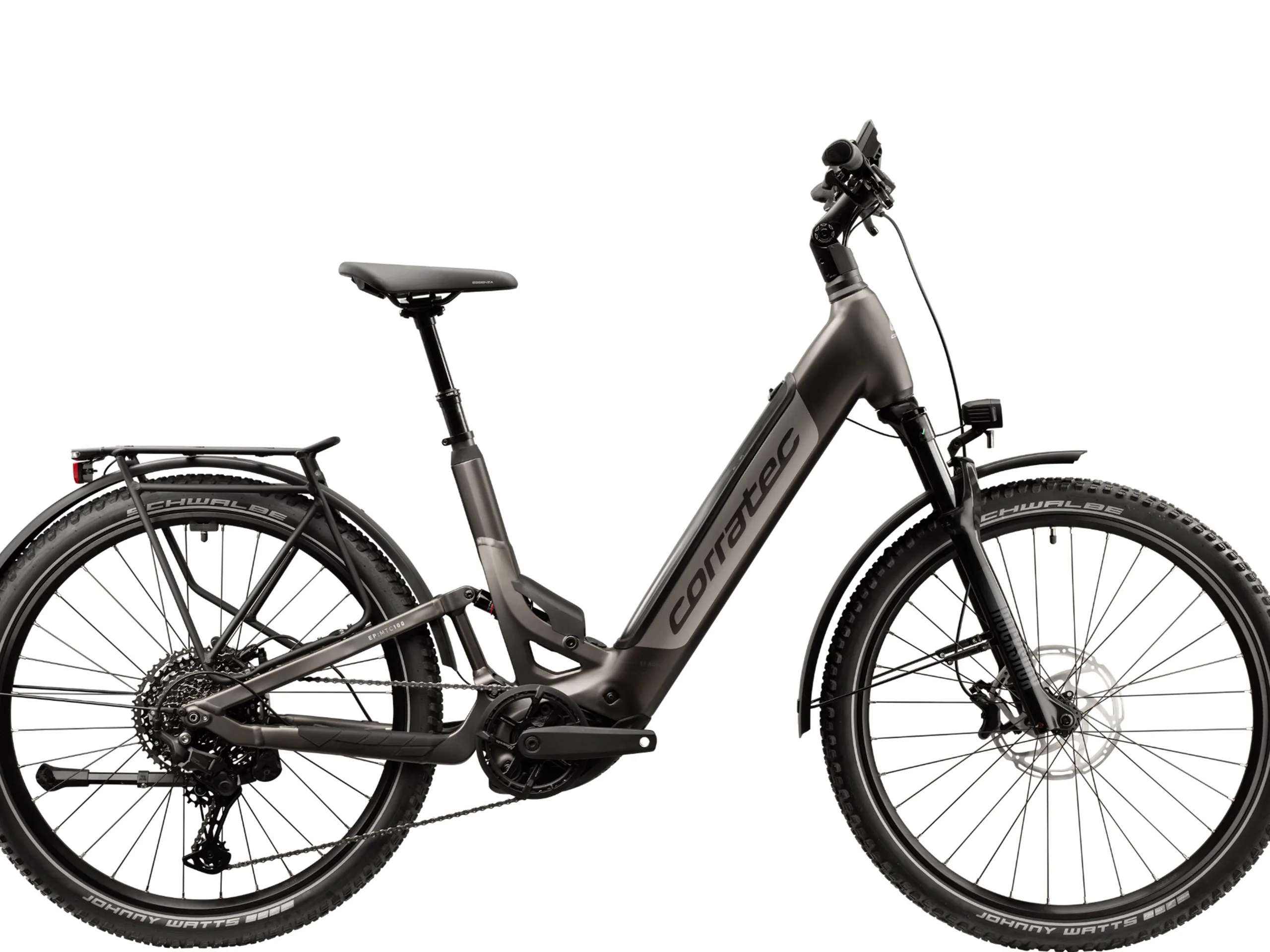 Mit dem MTC 100 Wave CX8 bietet Corratec ein E-Bike an, welches unter den Begriff SUV-E-Bike beschreibbar ist. Das Modell kommt nicht mit einem typischen Diamantrahmen, sondern ist ein Tiefeinsteiger und dürfte sich somit im Grundsatz auch von Personen mit eingeschränkter Mobilität nutzen lassen. Die Sattelstütze ist dabei noch absenkbar. Vorne und hinten ist eine Federung vorhanden, so kommt eine RockShox Recon Silver RL-Federgabel mit einem Federweg von 100 Millimetern zum Einsatz, der Dämpfer stammt ebenfalls von RockShox, es kommt ein Deluxe Select+-Dämpfer zum Einsatz. Mit dieser Ausstattung kann das MTC 100 Wave CX8 auch im Gelände eingesetzt werden. Vorne und hinten sind Schwalbe Jonny Watts-Reifen aufgezogen, welche neben einer langen Haltbarkeit zudem noch mit einem Pannenschutz beworben werden. Auf härteren Untergründen - also etwa Asphalt - sollen die Reifen trotzdem leicht laufen.