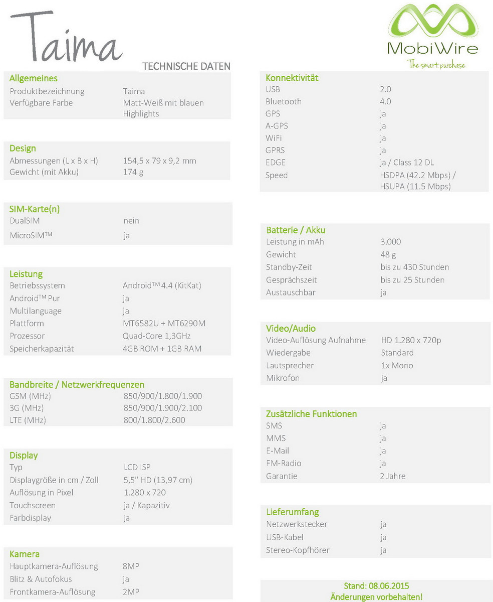 Zur weiteren Ausstattung des Franzosen zählen ferner zwei integrierte Kameras (8 MP hinten, 2 MP vorne), Wi-Fi, Bluetooth 4.0 sowie USB 2.0. Die Energieversorgung des Smartphones übernimmt ein 3000-mAh-Akku. Als Mobile-OS läuft auf dem Taima noch Googles Android 4.4 KitKat. Ob es ein Update auf das neueste Android 5.0 Lollipop geben wird, verrät MobiWire in seiner Produktankündigung nicht.