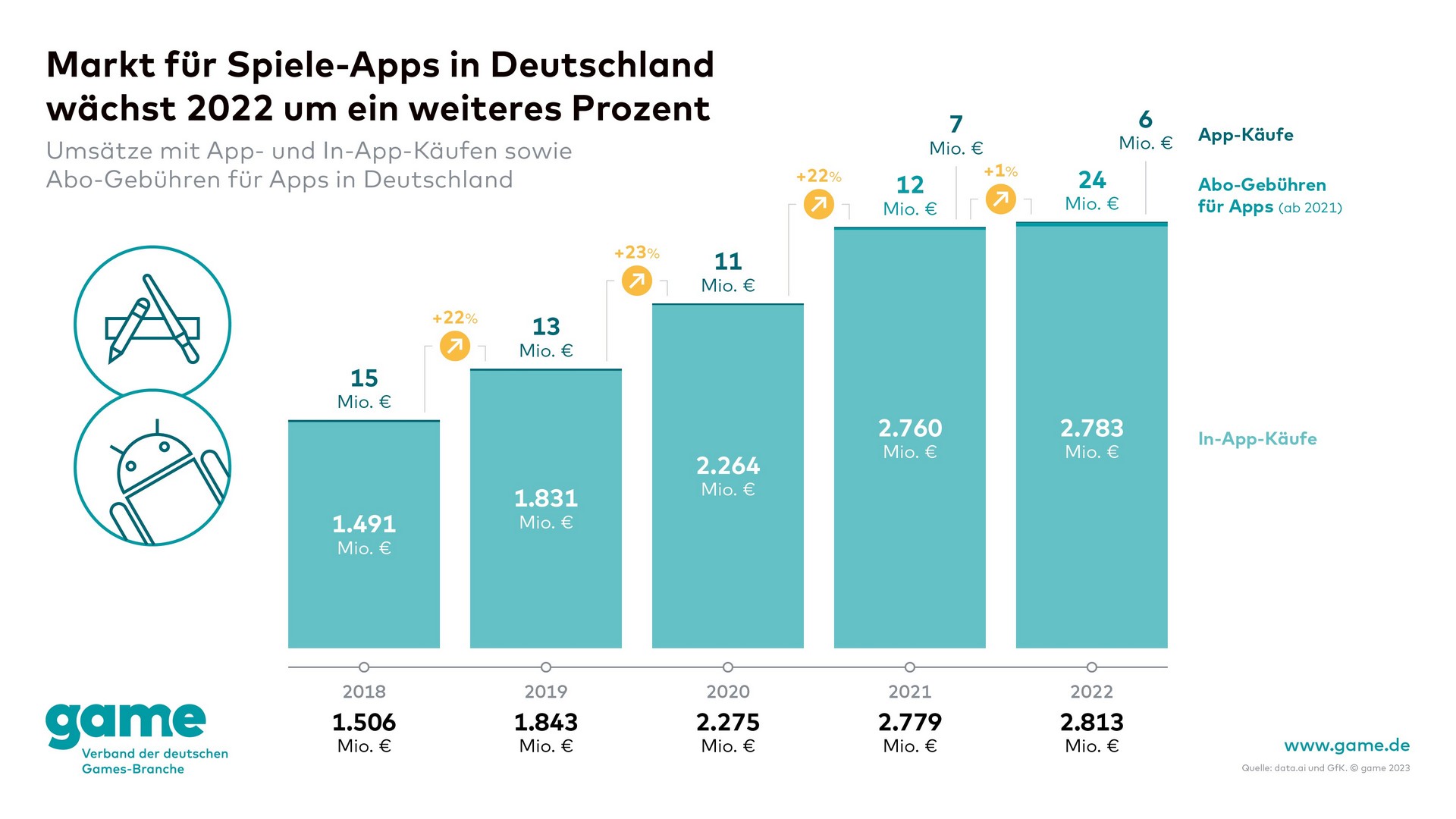 Smartphone und Tablet sind ideale "Spielkonsolen", um zwischendurch mal eben bei schnell bei einem Spielchen zu entspannen. Games auf Handy oder Tablet werden auch in Deutschland immer beliebter, der Markt für Mobile Games wächst auch hierzulande leicht. Wie der Branchenverband game berichtet, stieg der Umsatz mit Spiele-Apps bereits 2020 und 2021 deutlich um insgesamt rund 50 Prozent. 2022 stabilisierte sich der Mobile-Spielemarkt mit plus 1 Prozent bei rund 2,81 Milliarden Euro.