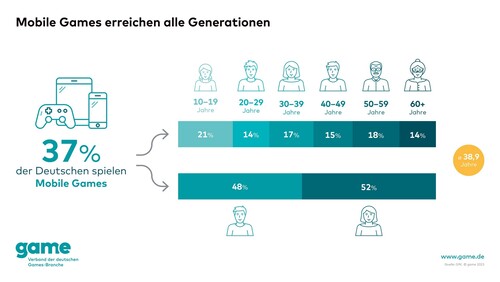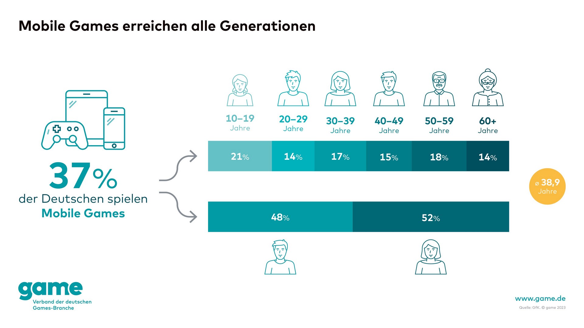 In der Bundesrepublik spielen inzwischen vier von 10 Deutschen (37 Prozent) mobile Games auf Smartphone oder Tablet. Spiele-Apps sind nicht nur bei den Jüngeren sehr beliebt, sondern werden auch sehr gerne von Älteren genutzt. 32 Prozent der Mobile-Gamer sind 50 Jahre alt oder älter. Das Durchschnittsalter der Mobile-Spielerschaft liegt aktuell bei 38,9 Jahren und damit höher als bei anderen Plattformen wie PC oder Spielkonsole. 21 Prozent der 10- bis 19-Jährigen spielen ebenfalls sehr gerne Handy-Games. Der Frauenanteil bei der Mobile-Spielerschaft liegt bei 52 Prozent.