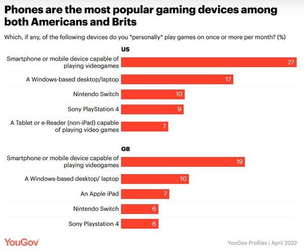 Wie eine aktuelle Auswertung entsprechender Daten von YouGov zeigt, ist das Smartphones als Spielgerät inzwischen das beliebteste Gaming-Device rund um den Globus. So geben mehr als ein Viertel (27 Prozent) der Amerikaner und ein Fünftel der Briten (19 Prozent) an, dass sie einmal oder öfter pro Monat Spiele auf ihrem Handy spielen. Somit liegt das Smartphone weit vor anderen Spieleplattformen wie Microsoft Xbox, Sony PlayStation oder Nintendo Switch respektive dem PC.