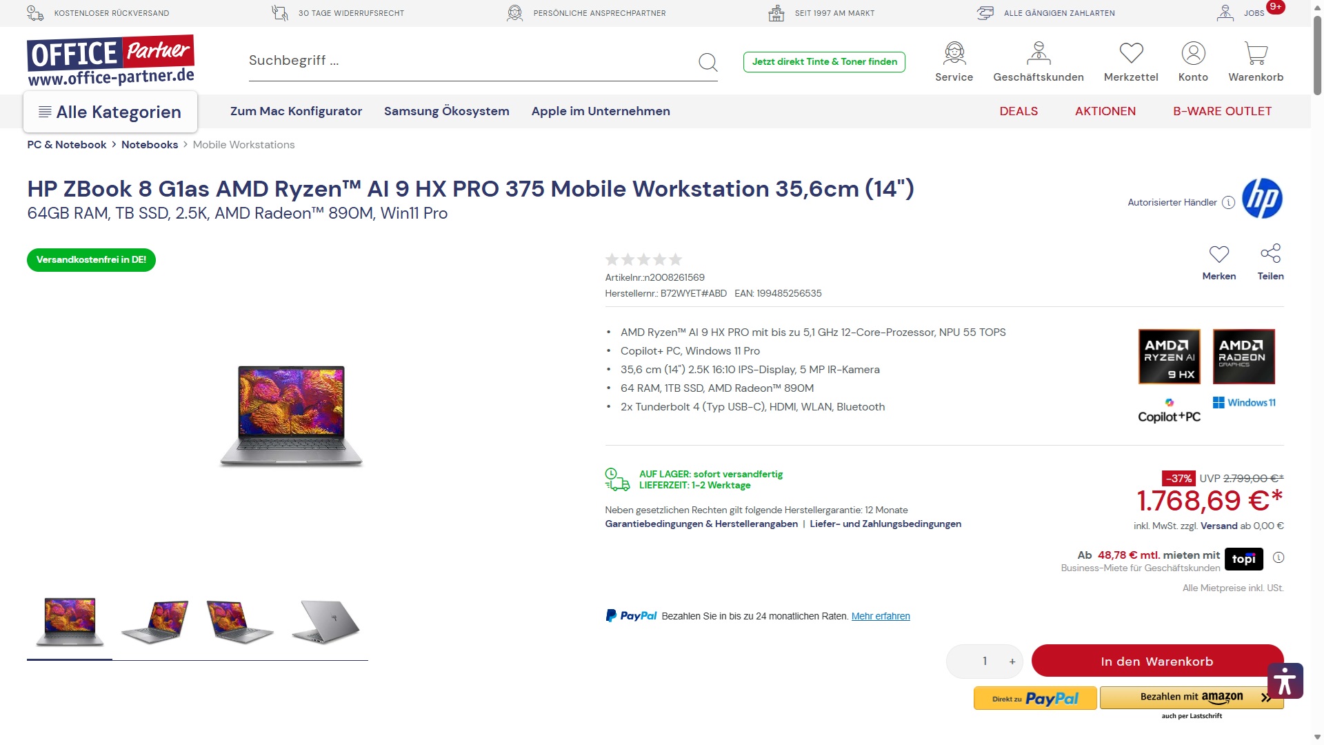 Die ZBook-Reihe der Firma Hewlett Packard beinhaltet Workstations für professionelle Anwender. Aktuell führen Office-Partner.de und Playox.de mit dem ZBook 8 G1as (B72WYET) einen AMD-basierten 14-Zoll-Vertreter der Reihe zu einem Angebotspreis von knapp 1.769 Euro in ihren Sortimenten. Es lagen uns bereits zwei Intel-Schwestermodelle vor, die beide die Note "Gut" (iGPU-Modell: 82 %, dGPU-Modell: 85 %) ergattern konnten.