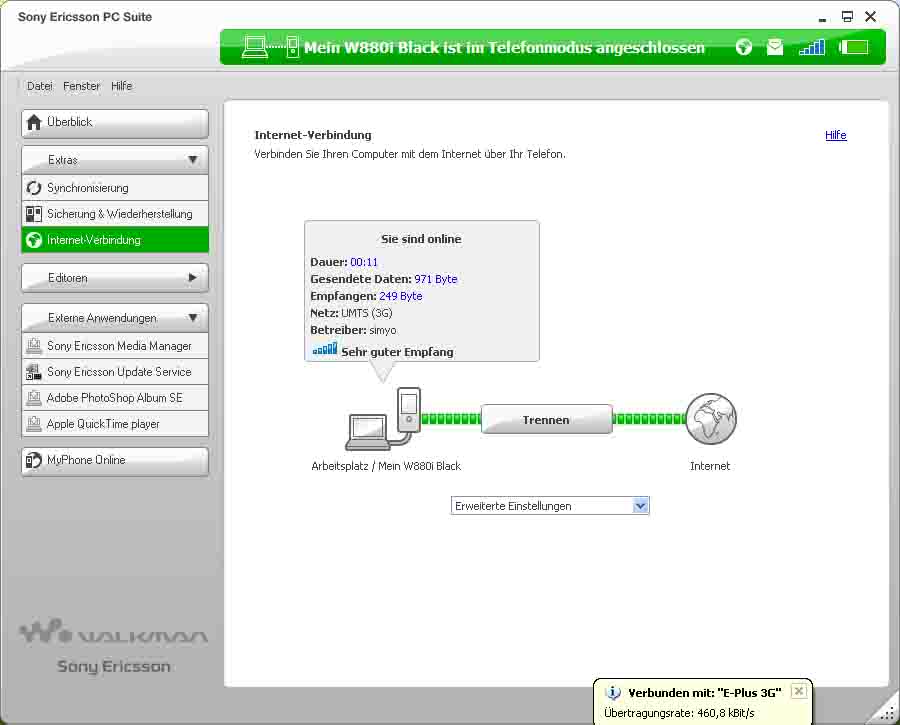 Unsere Tests haben wir in drei verschiedenen Netzen durchgeführt. E-Plus, O2 und T-Mobile. Testgebiet war der Großraum Bonn (Innenstadt, Stadtrand/ Dienstleistungsviertel und der ländliche Raum. Während im Stadtbereich immer voller Verbindungsausschlag erreicht wurde, kam es im ländlichen Gebiet je nach Standort öfter zu Verbindungsabbrüchen und Wechseln zwischen GPRS, EDGE und UMTS.