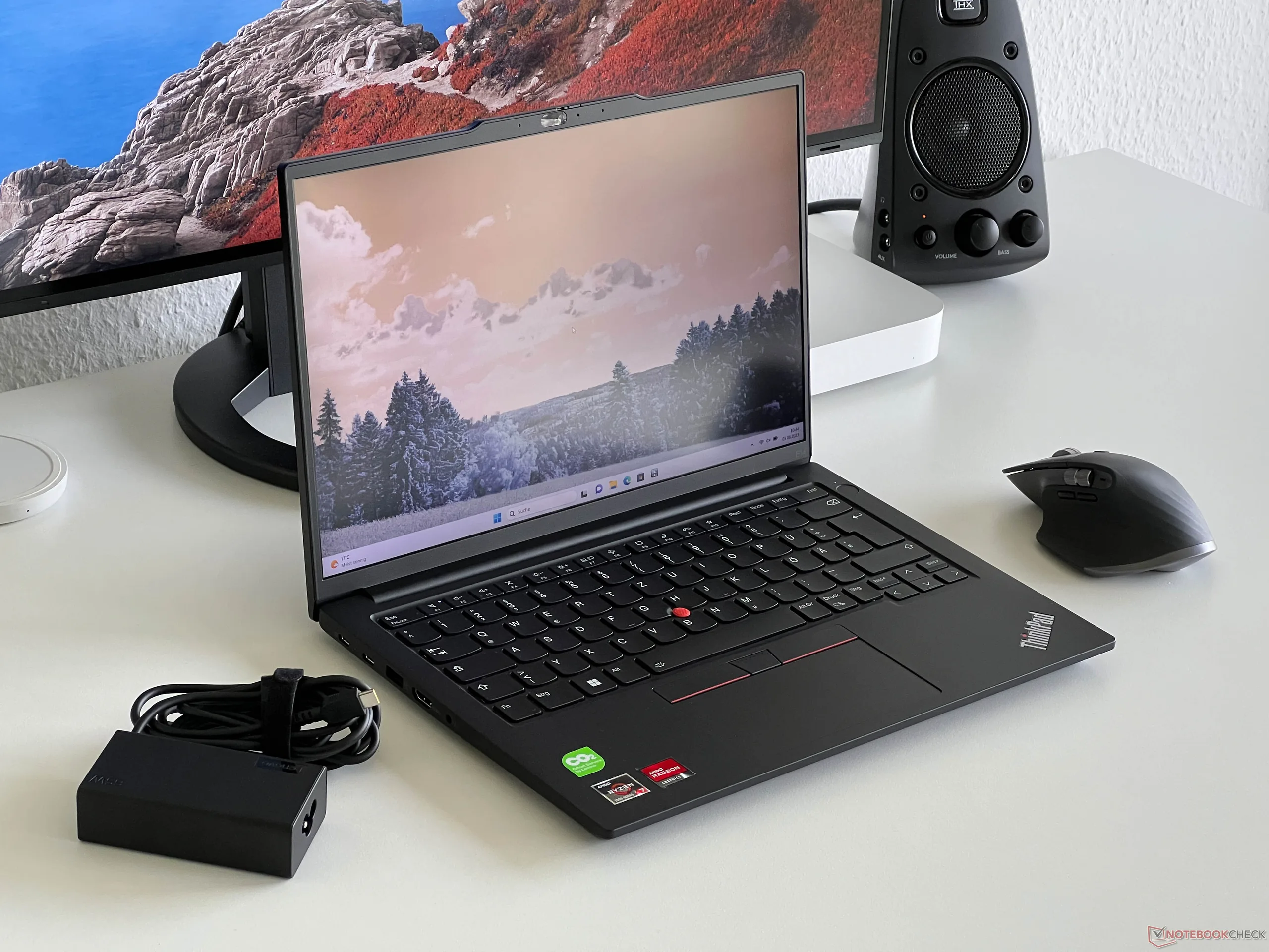 Gute Akkulaufzeiten sind gegeben: Das getestete Schwestermodell erreichte in unserem WiFi-Test einen Wert von knapp 10 h. Thunderbolt 4 bzw. USB 4 sucht man vergeblich. Immerhin: Die zwei USB-C-Ports (1x USB 3.2 Gen 2, 1x USB 3.2 Gen 1) des E14 beherrschen Power Delivery und den DP Alt-Mode. Als Betriebssystem dient Windows 11 Pro.