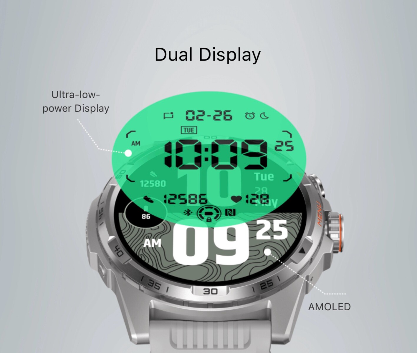 Über diesem Panel sitzt ein Segment-Display, das extrem sparsam sein soll, und vor allem zur Darstellung des Always-on-Displays genutzt wird. In Verbindung mit dem Qualcomm Snapdragon W5+ Gen 1 soll die Smartwatch eine Laufzeit von 90 Stunden bei normaler Nutzung sowie bis zu 45 Tagen im Stromsparmodus erreichen. Die Uhr unterstützt dank Google Wear OS auch Drittanbieter-Apps. Ein Kompass, ein Höhenmesser und ein GPS-Modul unterstützen Nutzer bei der Navigation. Der Herzfrequenz-Sensor ist rund um die Uhr aktiv, um Nutzer bei einer auffällig hohen oder niedrigen Herzfrequenz zu benachrichtigen.