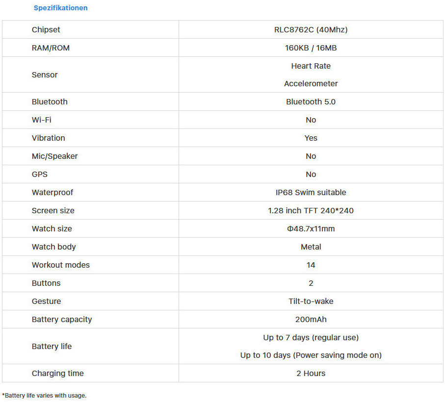 Die Mobvoi TicWatch GTX ist gemäß IP68 staub- und wasserdicht und bietet 14 Workout-Modes. Zudem unterstützt die mit einem runden 1,28-Zoll-TFT (240 x 240 Pixel) ausgestattete Watch Bluetooth 5.0, Schlaftracking und 24/7-Puls-Überwachung. Der eingebaute 200-mAh-Akku soll im "Power Saving"-Mode bis zu 10 Tage durchhalten. Integriertes GPS und Wi-Fi hat die GTX nicht an Bord.