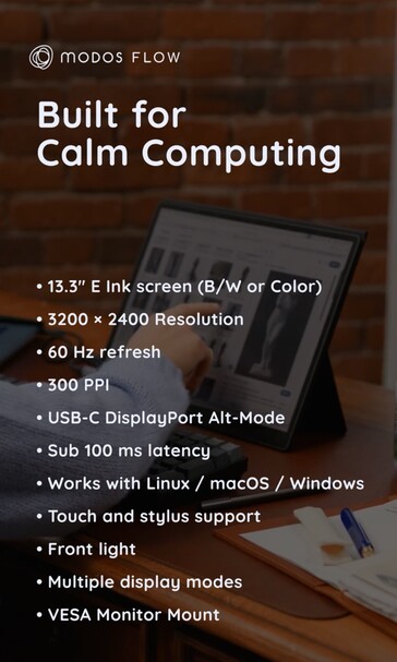 Modos hat bereits im Vorjahr ein mobiles E-Ink-Display auf den Markt gebracht, Modos Flow bietet aber eine weitaus bessere Ausstattung. Allen voran erreicht der neue mobile E-Ink-Monitor mit einer Diagonale von 13,3 Zoll eine deutlich höhere Auflösung von 3.200 x 2.400 Pixel bei einer Pixeldichte von 300 PPI.