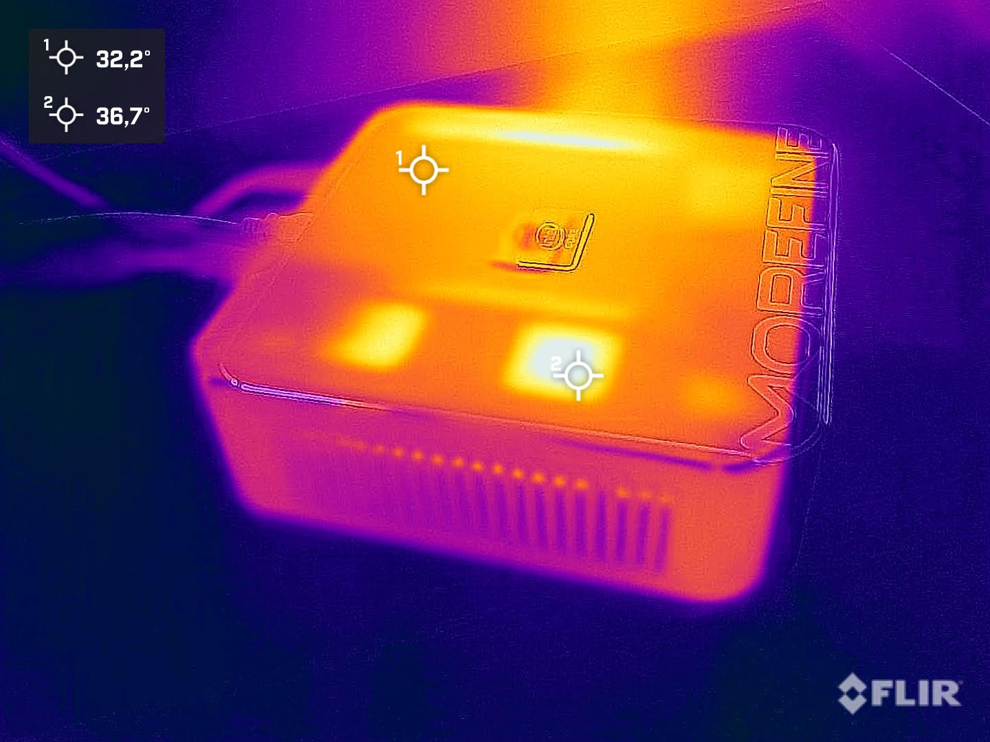 In Anbetracht der Leistung des Morefine S600 Apex Engineer ist der Energiebedarf unter Last auf einem guten Level. Maximal 80 Watt zeigt unser Messgerät. Gleichwohl gibt es im Leerlauf noch viel Optimierungsbedarf, denn mit 46,5 Watt im idle ist der Verbrauch deutlich zu hoch.