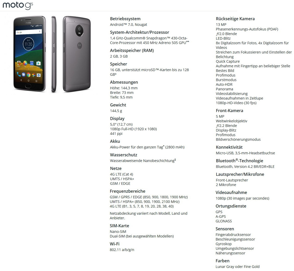 Das Moto G5 ist schon die 5. Modellreihe der Moto G Smartphone-Serie. Das Moto G5 kommt in einem Metall-Design und den Farboptionen Lunar Gray oder Fine Gold daher. Lenovos neues Moto G5 misst 144,3 x 73 x 9,5 Millimeter und bringt es als 5-Zoll-LTE-Smartphone mit Full-HD-Display und einer Auflösung von 1.920 x 1.080 Pixeln auf ein Gewicht von 144,5 Gramm. Das Moto G5 ist ab diesem Wochenende für rund 200 Euro bei Media Markt, Saturn, Amazon sowie ausgewählten Vertriebspartnern erhältlich.