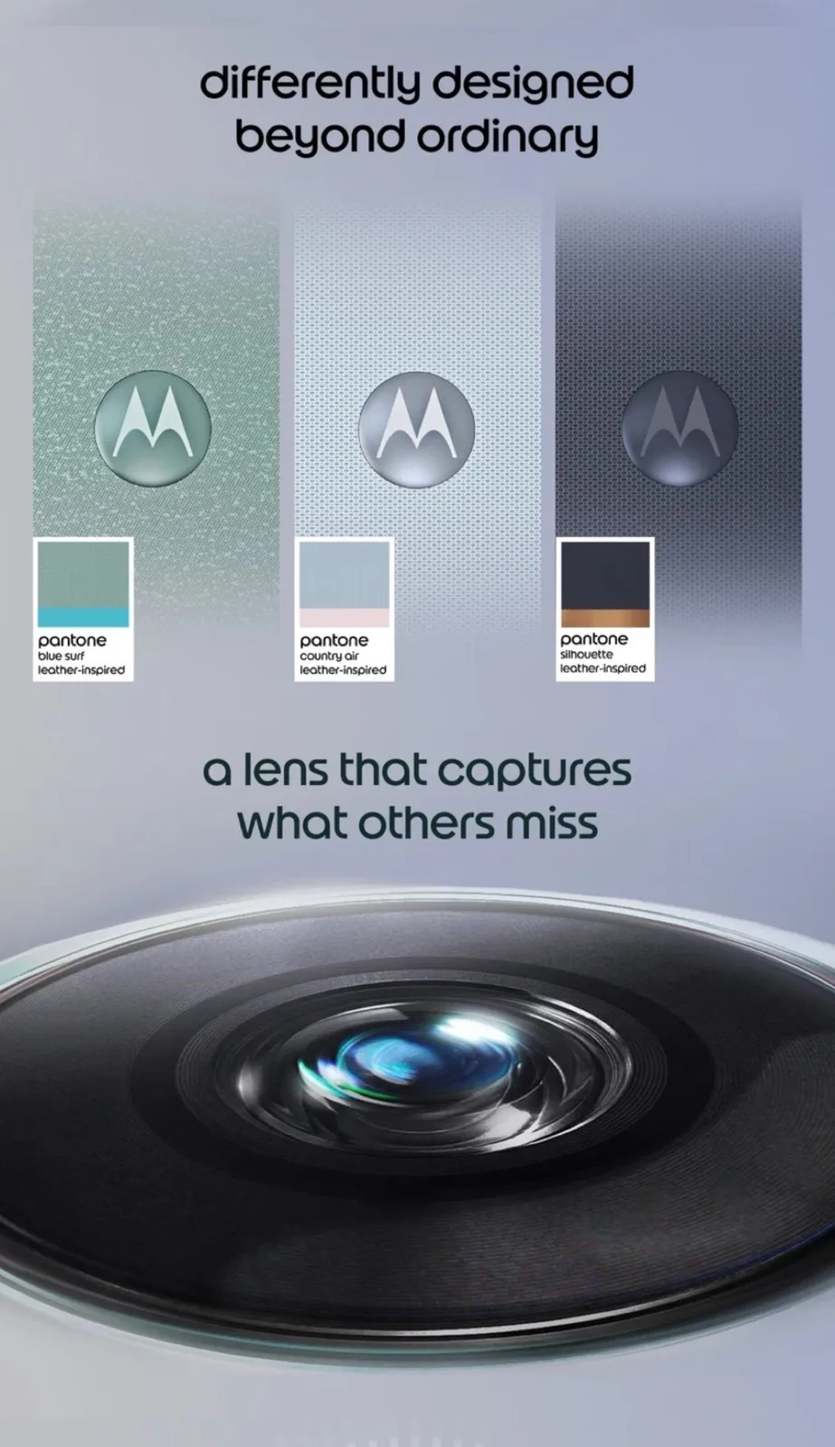 Ein Teaser-Bild zeigt das Mittelklasse-Smartphone bereits in den Farben Blue Surf (Türkis), Country Air (Hellblau) und Silhouette (Dunkelblau), laut der geleakten Promo-Bilder wird das Smartphone aber auch in Violett, in Dunkelgrün und in Schwarz angeboten. Motorola setzt in jedem Fall auf eine Rückseite mit Leder-Textur. Das Smartphone soll als günstigere Alternative zum Motorola Edge 70 (ca. 599 Euro auf Amazon) positioniert werden.