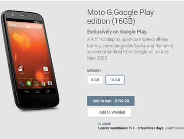An den Preisen ändert sich allerdings bei der Google Play Edition nichts. So kostet das Moto G im Google-Shop in der Ausführung mit 8 GByte 180 US-Dollar und mit 16 GByte knapp 200 Dollar. Bis auf das Stock-Android gibt es zwischen den Modellen hinsichtlich der technischen Ausstattung bei den Kernkomponenten keinen Unterschied. Allerdings müssen die Käufer einer Play Edition auf einige Zusatzfunktionen von Motorola verzichten.