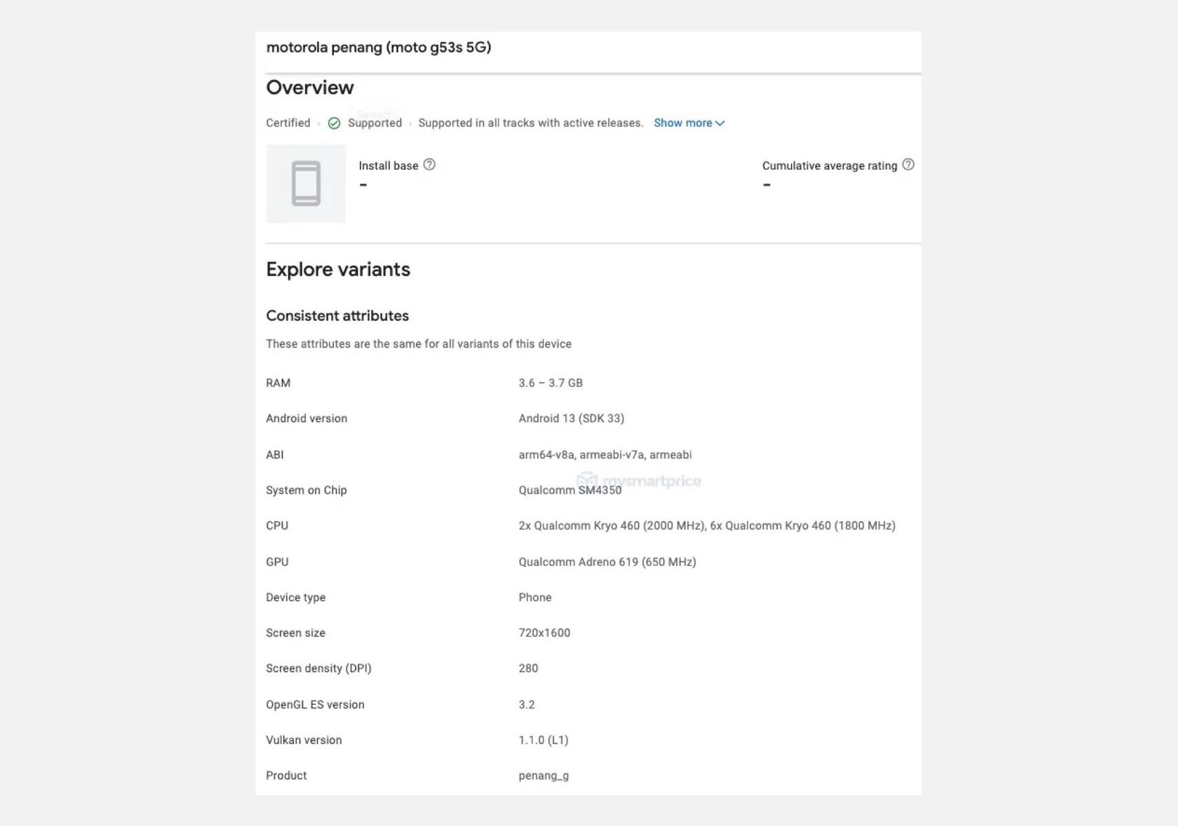 Bislang ist nicht bekannt, ob das Display wie auch beim Moto G53 eine Bildfrequenz von 120 Hz unterstützt. Motorola verbaut einen Qualcomm Snapdragon 480, einen Mittelklasse-SoC aus dem Jahr 2021, der zwei leistungsstarke ARM Cortex-A76-Rechenkerne mit Taktfrequenzen bis 2,0 GHz mit sechs sparsamen Cortex-A55-Kernen bei 1,8 GHz kombiniert. Zumindest eine Variante des Smartphones ist mit 4 GB Arbeitsspeicher ausgestattet. Das Moto G53s ist mit einem 5.000 mAh Akku ausgestattet, der allerdings nur mit maximal 10 Watt aufgeladen werden kann.