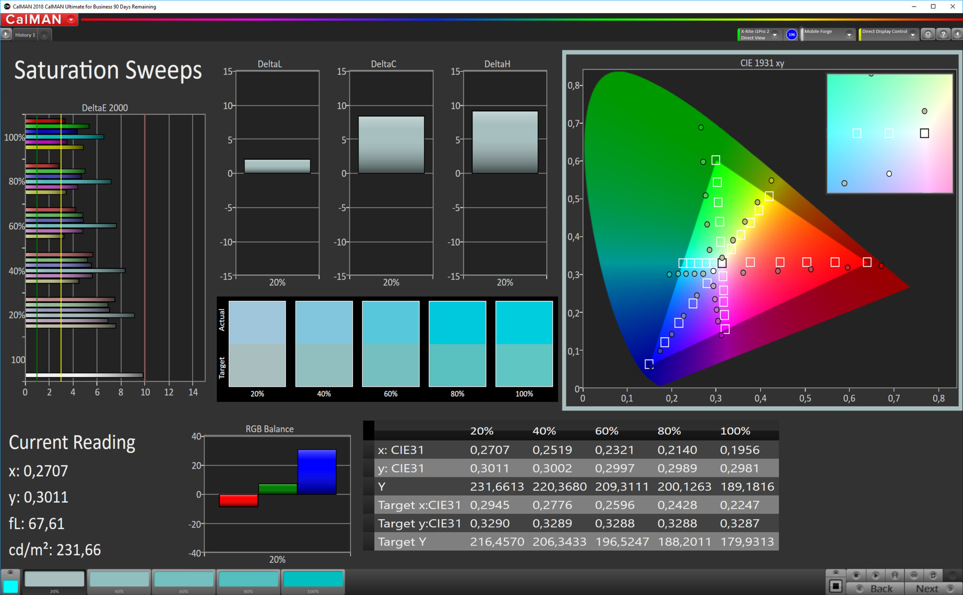 | Delta E Graustufen * | 7.7 | 2.7 65% | 1.6 79% | 2.5 68% | 2.5 68% | 3.9 49% |
