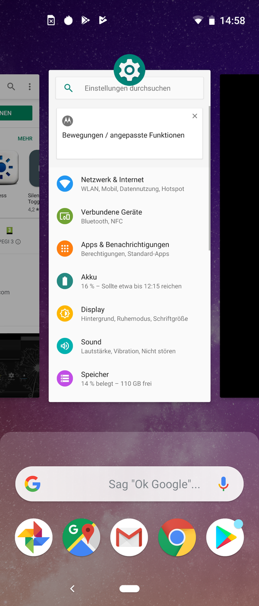 Der Touchscreen ist sehr gleitfähig und empfindlich, das gilt auch in den Ecken und an den Rändern. Die vorinstallierte Gboard-Tastatur lässt sich problemlos austauschen. Über die Moto-App sind vier erweiterte Steuerungsmöglichkeiten auswählbar. So wird etwa die Taschenlampe durch eine Hackbewegung aktiviert, durch zweimaliges Drehen die Kamera-App aufgerufen, außerdem lassen sich eine Ein-Tasten-Steuerung einrichten und Screenshots sind mit drei Fingern möglich.
