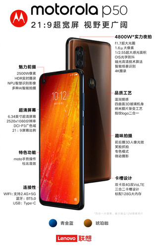 Für die Vorder- und Rückseite des Motorola P50 verwendet Lenovo wie beim Motorola One Vision viel Glas. Vorne kommt zu den Seiten abgerundetes 2,5D-Glas zum Einsatz, die Rückseite wird von 3D-Corning Gorilla Glass verschönert. Als Kameras bietet das Motorola P50 eine Dual-Kamera (48/5 MP), vorne ist eine 25-MP-Selfiecam integriert. Wi-Fi 802.11ac, Bluetooth 5.0, USB-C und Android 9 Pie als Betriebssystem runden die Ausstattung des P50 ab.