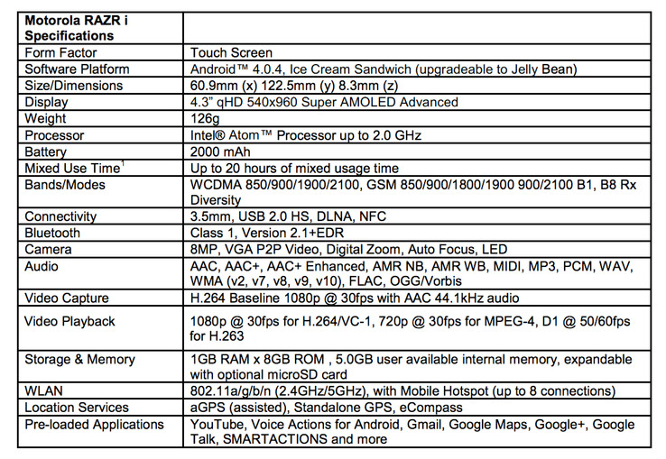 Auf einem Event in London haben Motorola Mobility – eine Tochter von Google – und Chipriese Intel ein neues Smartphone vorgestellt. Das Motorola RAZR i basiert auf einem Intel Atom Z2460 Prozessor mit einer Leistung von bis zu 2 GHz (1.3 GHz Basis). Genauere Details zu dem Gehirn des Smartphones haben die Unternehmen bei der Vorstellung nicht genannt. Die CPU unterstützt allerdings die Hyper Threading Technologie. Das nächste Zugpferd soll ein 4,3 Zoll großer qHD Super AMOLED Advanced Bildschirm sein, der mit 960 x 540 Pixel auflöst. In diesem Kontext vergleicht Motorola den Bildschirm mit der Anzeigengröße des iPhone 4 beziehungsweise der kürzlich präsentierten Apple iPhone 5. Der Bildschirm des RAZR i ist ein wenig größer, bietet im Vergleich aber die geringer Auflösung. Das neuste Smartphone aus Cupertino bietet 1136 x 640 Pixel, wobei 720p-Videos (1280 x 720 Pixel) bei beiden Geräten nicht nativ dargestellt werden können.