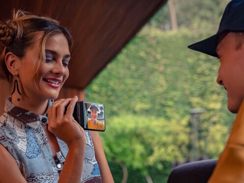 Das Scharnier kann das Display im halb aufgeklappten Zustand halten – praktisch für Videochats, und um Fotos bei wenig Licht aufzunehmen, da das Scharnier des Smartphones so effektiv zu einem Stativ wird. Wird die Kamera-App verwendet, um ein Porträt von jemandem aufzunehmen, kann die fotografierte Person ebenfalls eine Vorschau auf dem Zweitdisplay sehen. Dieses Feature macht es auch einfacher, Selfies mit der Hauptkamera aufzunehmen.