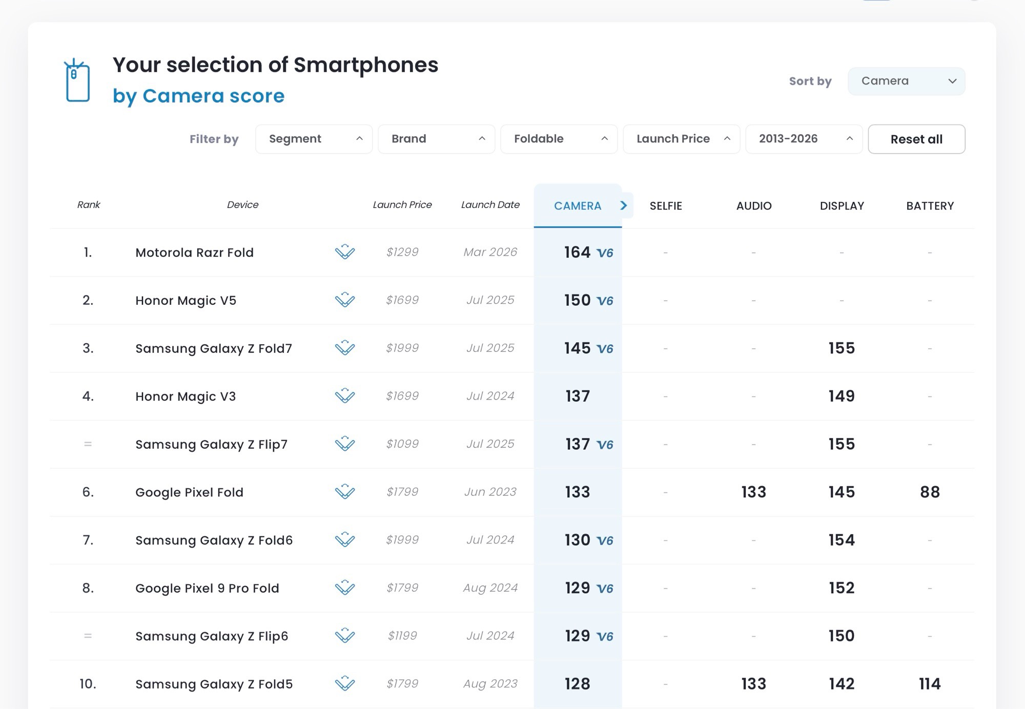 Mit 164 Punkten setzt sich das Motorola Razr Fold an die Spitze der Foldables-Bestenliste, weit vor dem Honor Magic V5 mit 150 Punkten und dem Samsung Galaxy Z Fold7 (ca. 1.680 Euro auf Amazon) mit 145 Punkten. Mit den besten nicht faltbaren Smartphones kann Motorola aber nicht ganz Schritt halten, das Huawei Pura 80 Ultra liegt mit 175 Punkten noch ein Stück in Führung.