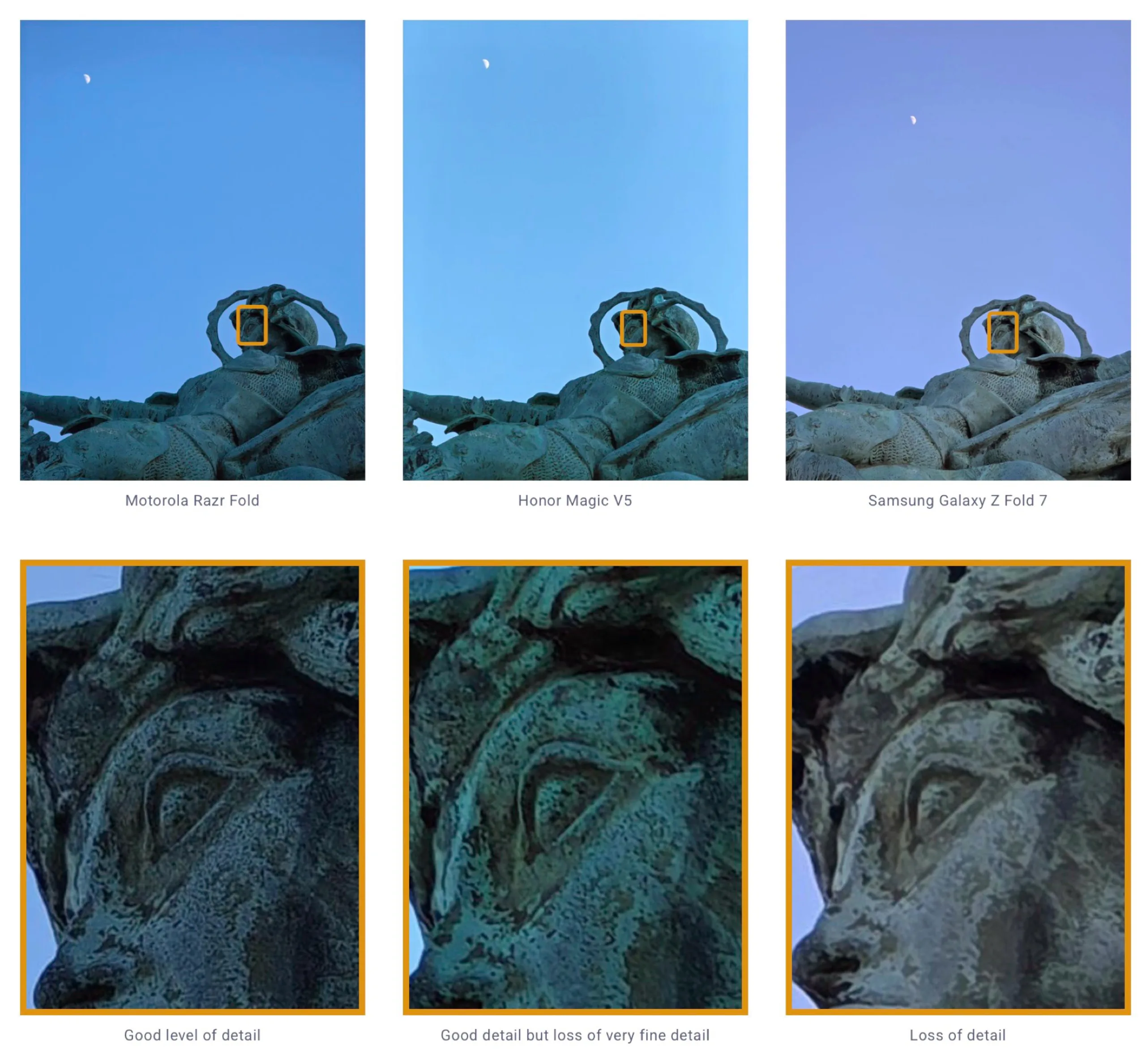 Gerade die Tele-Kamera zeichnet sichtbar mehr Details auf als bei den Falt-Flaggschiffen der Konkurrenz. Punktabzug gibt es vor allem dafür, dass Bildrauschen selbst bei Tageslicht sichtbar ist. DxOMark kritisiert darüber hinaus mehrere Probleme bei Videoaufnahmen, inklusive einer ruckeligen Anpassung der Belichtung, zu langsamen Autofokus bei wenig Licht und einem inkonsistenten Weißabgleich, wenn während einer Videoaufnahme gezoomt wird.