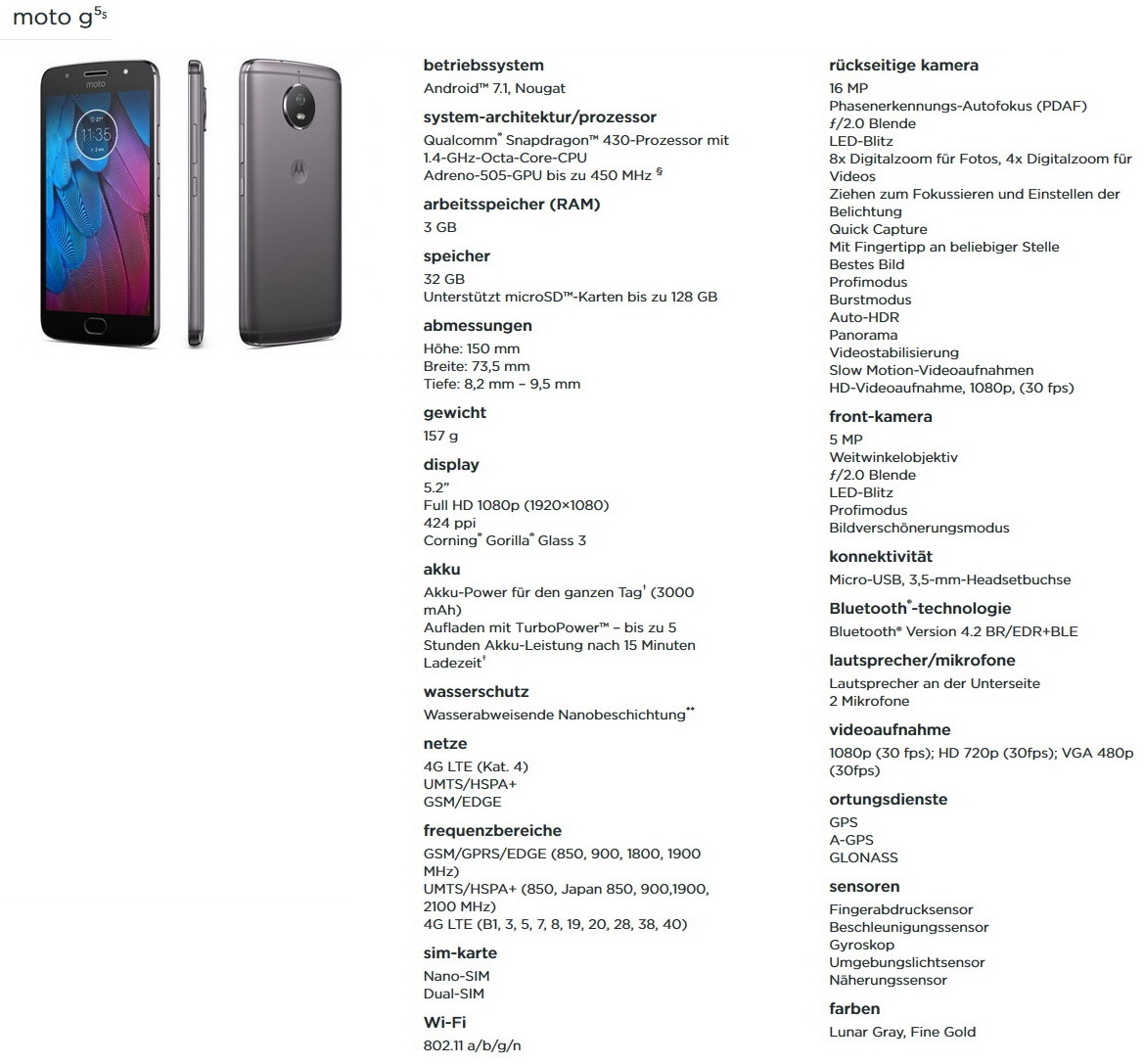 Das größere 5,5 Zoll Moto G5S Plus bietet als Special Edition eine 13-MP-Dual-Kamera mit f/2.0. Über den Tiefenschärfe-Editor soll sich mit dem selektiven Fokus-Modus für Porträts ein "verschwommener Hintergrund" erzeugen lassen. Alternativ erhalten Aufnahmen durch selektive Schwarz-Weiß-Färbung oder den Hintergrund-Modus einen ganz neuen Look. Vorne steht Nutzern des Moto G5S Plus für Selfies eine 8-MP-Weitwinkel-Frontkamera mit LED-Blitz und einem neuen Panoramamodus zur Verfügung. Angetrieben wird das Moto G5S Plus von einem Snapdragon 625 mit 3/32 GB Speicher. Ein 3.000-mAh Akku, ein integrierter Fingerabdrucksensor und Android 7.1 Nougat als OS runden die Ausstattung ab.