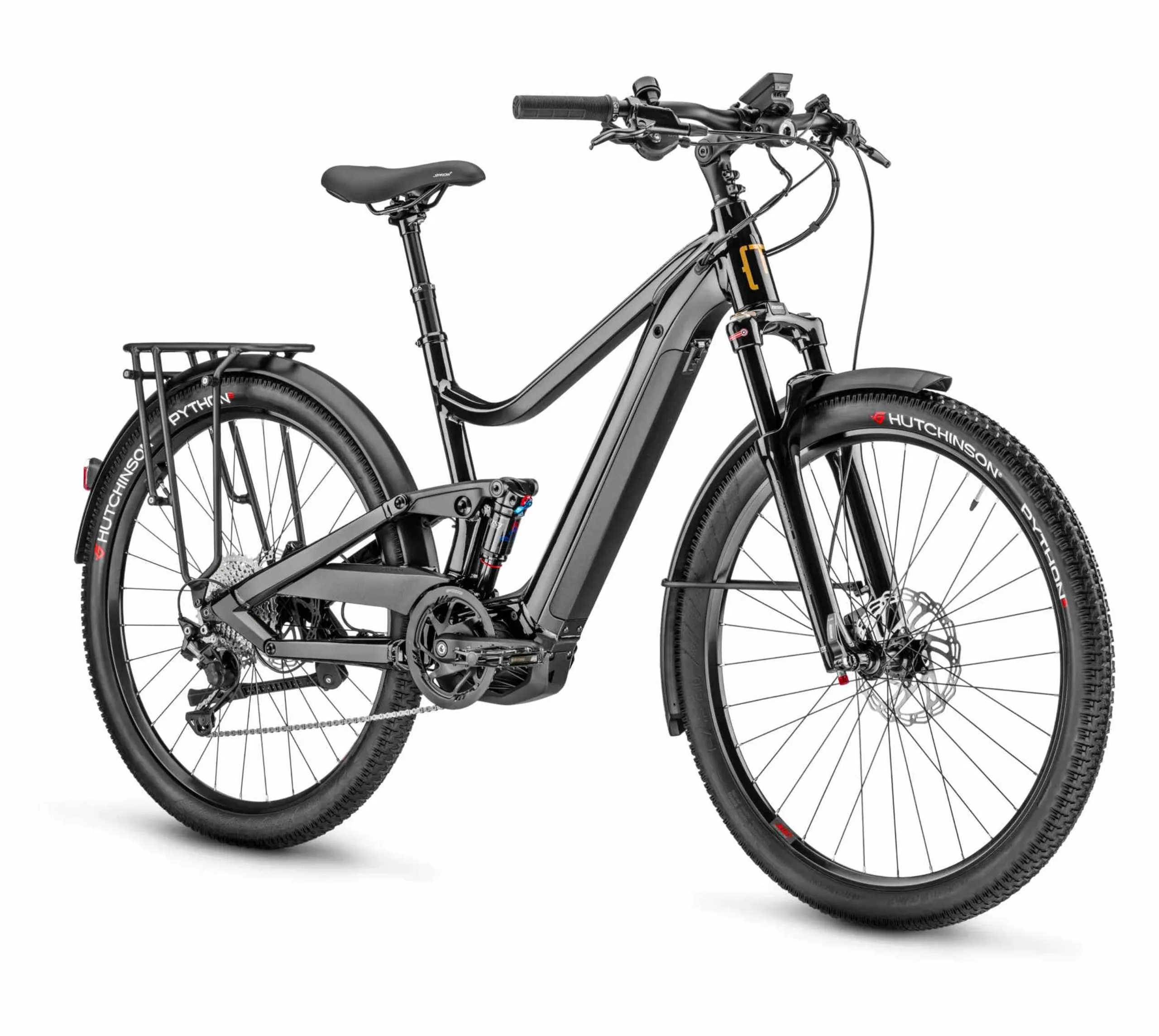 Bei den beiden E-Bikes Samedi 27 Xroad FS 6 und Samedi 27 Xroad FS 3 handelt es sich um vollgefederte E-Bikes, welche sich aber auch im Alltag ohne Einschränkungen einsetzen lassen sollen. Verbaut ist beim Samedi 27 Xroad FS 6 eine SR Suntour Mobie 25-Federgabel, beim Samedi 27 Xroad FS 3 kommt eine XCR 32 ATB-Federgabel zum Einsatz. Beide Federgabeln können in Bezug auf die Federvorspannung eingestellt werden, zudem lassen sich die Federungen feststellen. Der Magic Grip Control 100-Dämpfer stammt von Moustache selbst. Sinnvoll: Der Gepäckträger belastet nicht den Dämpfer. Der Gepäckträger kann MIK HD-Zubehörteile und QL3-Taschen aufnehmen. Aluminium-Schutzbleche zählen zur Ausstattung.